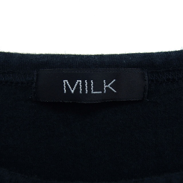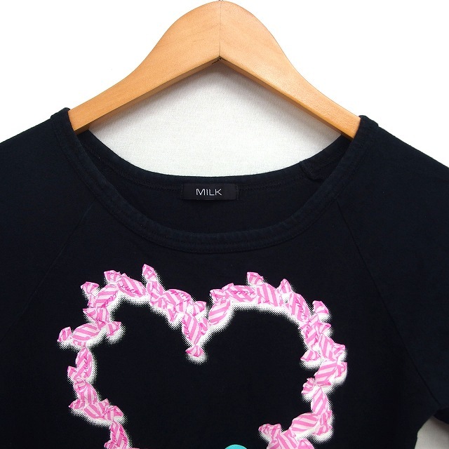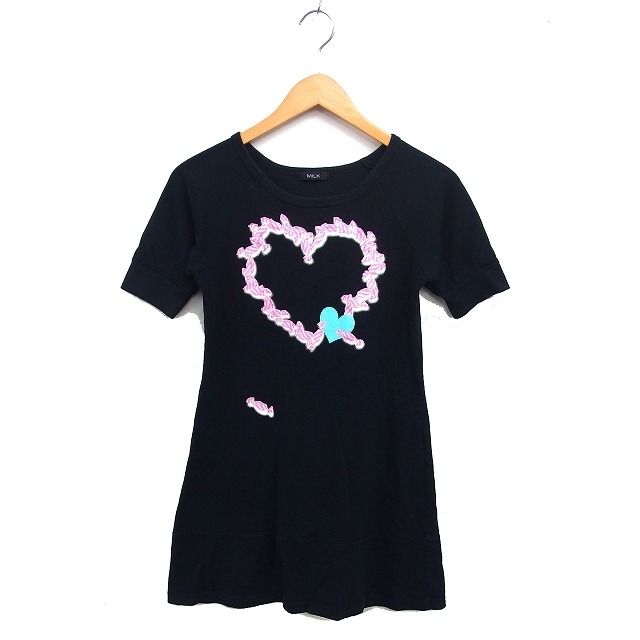 ミルク MILK ラグランスリーブ チュニック プリント ハート柄 ボートネック コットン 綿 半袖 黒 ブラック /NT8 レディース