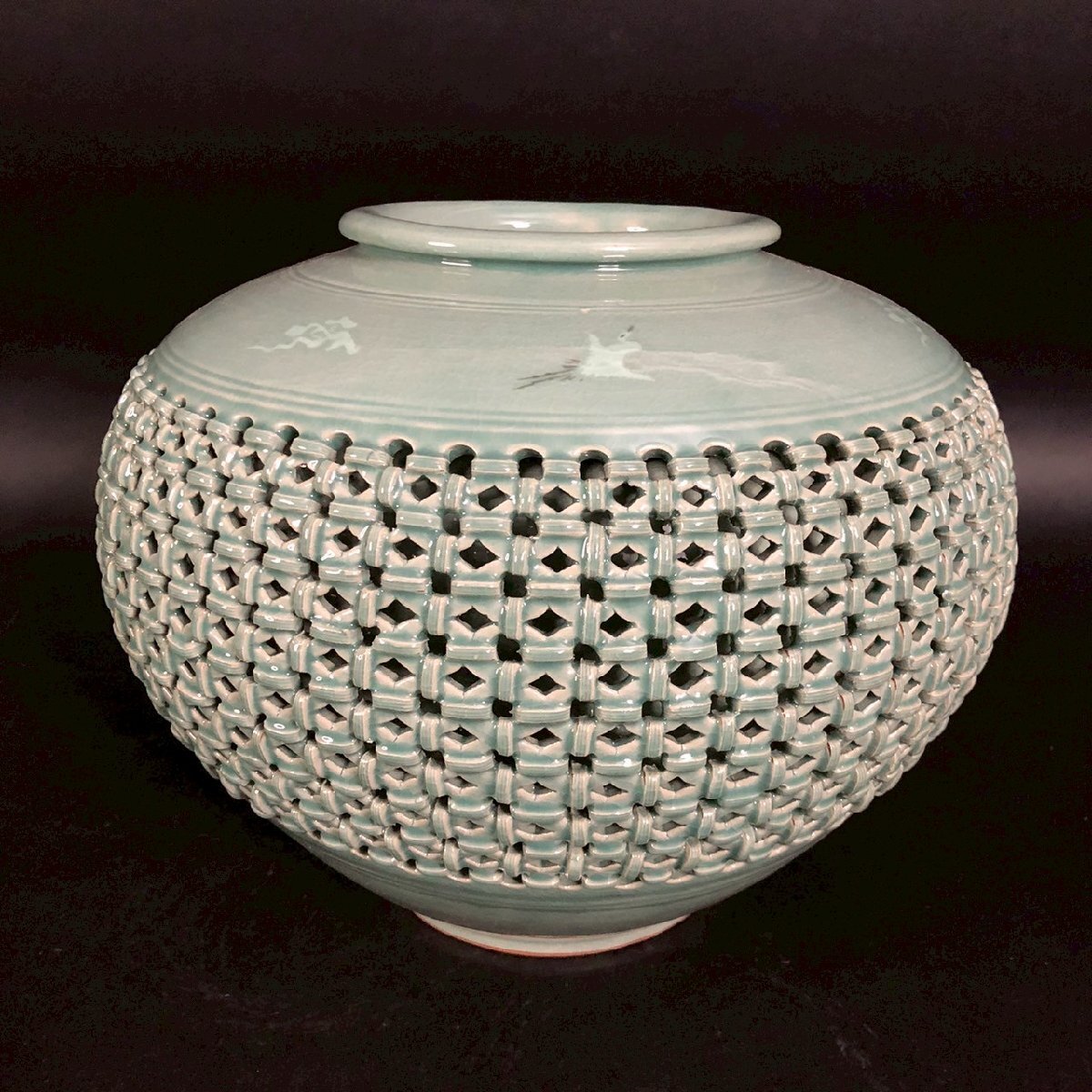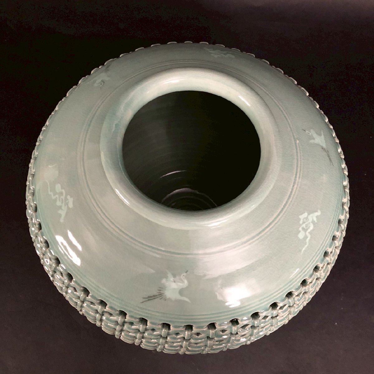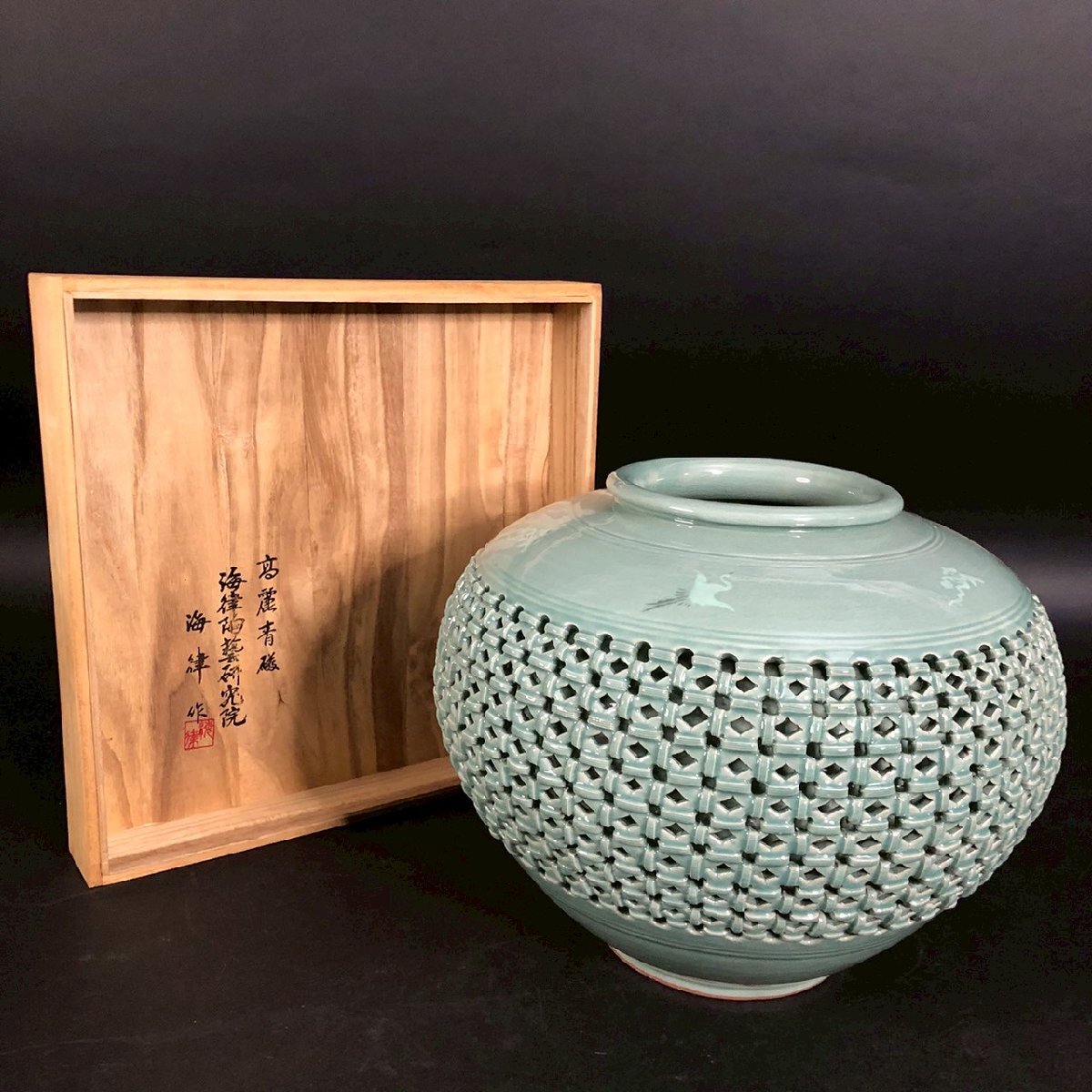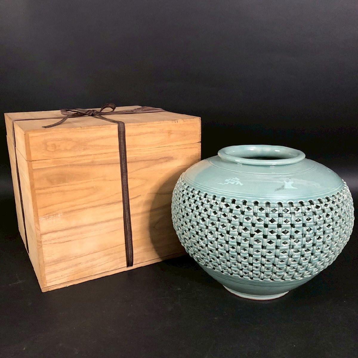 SW0527-7-3 海律 花瓶 花器 花入れ 高麗 青磁 陶器 陶芸 工芸 透かし彫り 伝統 青緑色 木箱 中国 高さ28㎝ 口径12.5㎝ 120サイズ