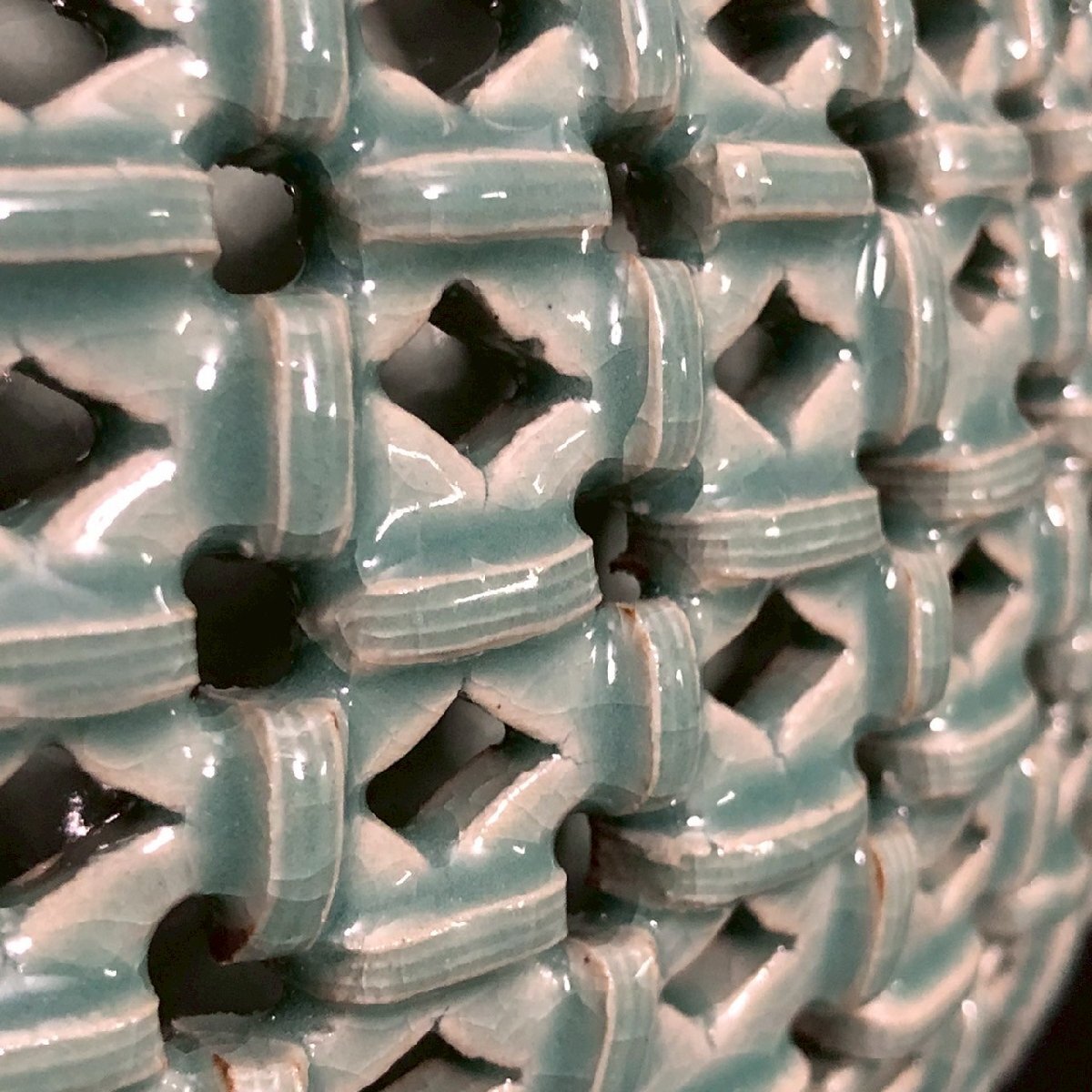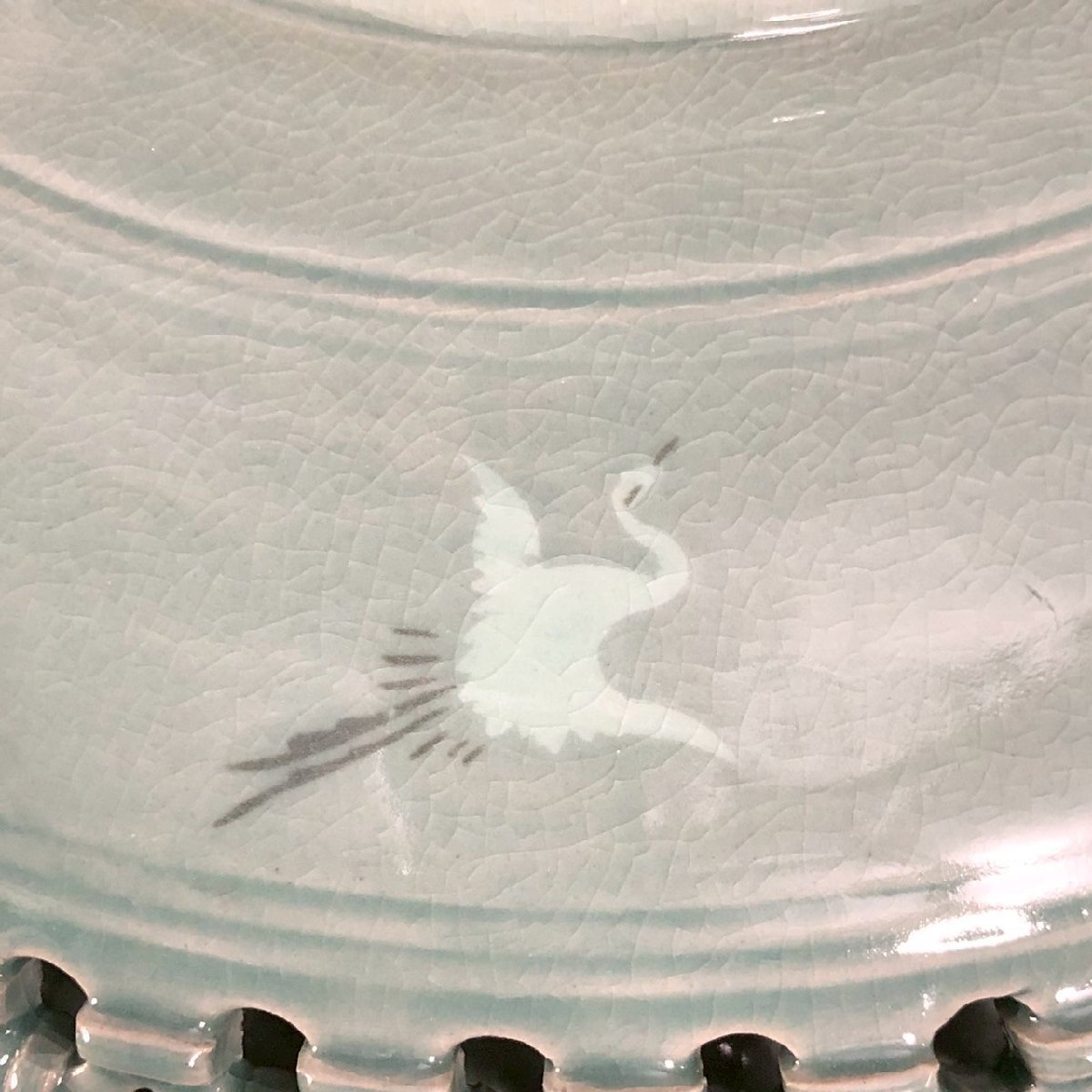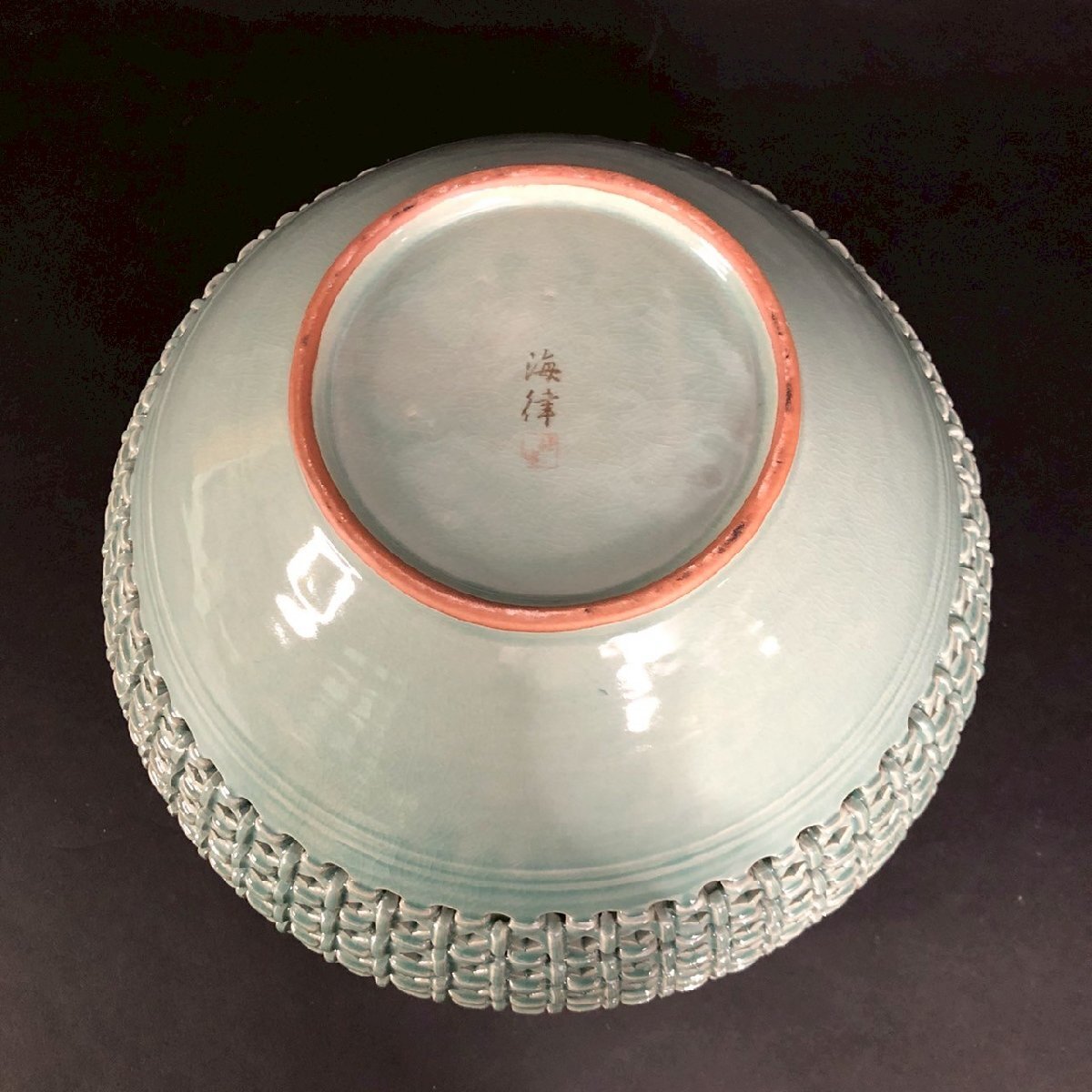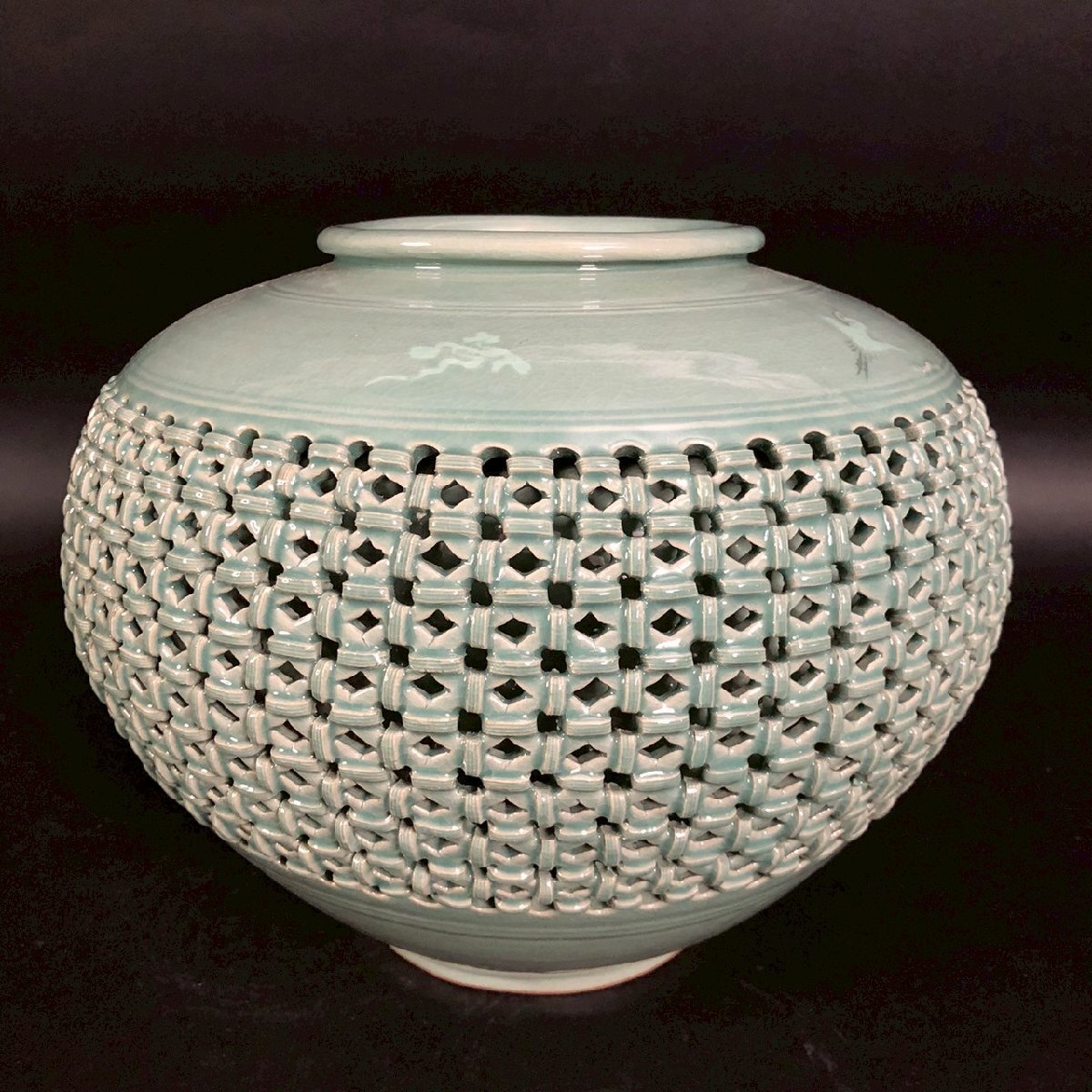 SW0527-7-3 海律 花瓶 花器 花入れ 高麗 青磁 陶器 陶芸 工芸 透かし彫り 伝統 青緑色 木箱 中国 高さ28㎝ 口径12.5㎝ 120サイズ