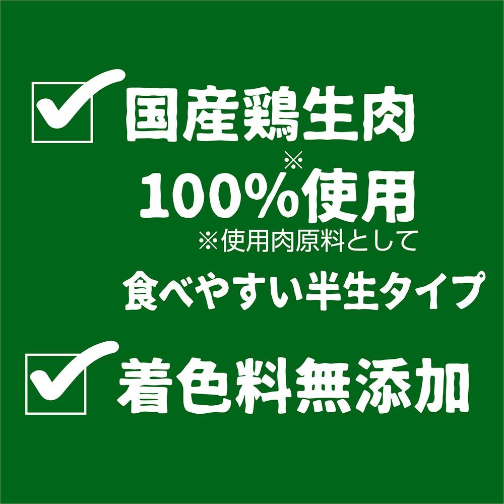 肉類(鶏、鶏レバー)、小麦粉、脱脂大豆、でんぷん類、脱脂米ぬか、糖類、植物性油脂、リモナイト、食塩、かつお粉末、オリゴ糖、サメ軟骨抽出物(コンドロイチン含有)、酵母、乳酸菌(EC-12株(熱処理済み))、グリセリン、プロピレングリコール、ミネラル類(カルシウム、塩素、亜鉛、鉄、ケイ素、銅、ヨウ素、マンガン、コバルト)、ソルビトール、pH調整剤、リン酸塩(Na)、酸化防止剤(V.E、エリソルビン酸Na)、ビタミン類(A、B2、B12、D、E、コリン、パントテン酸)、グルコサミン、香料、メチオニン