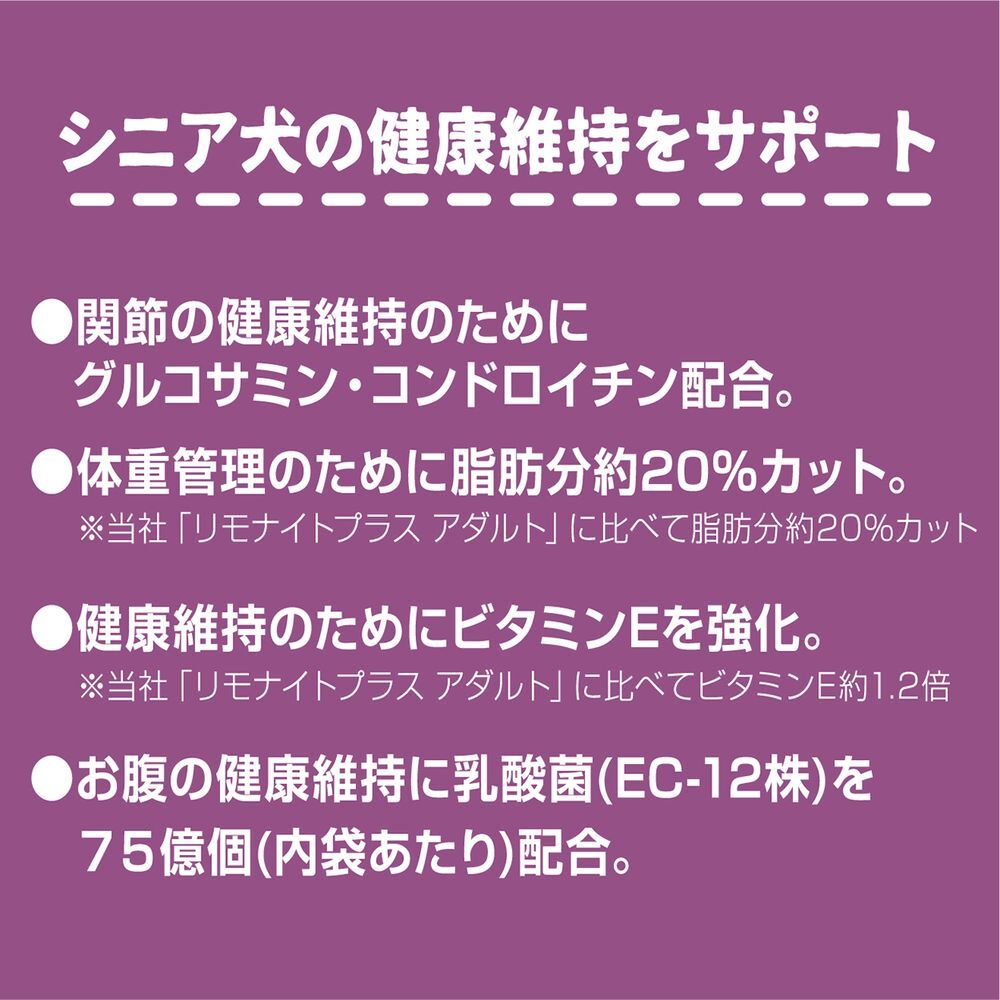 阿蘇の天然ミネラル「リモナイト」が便臭・尿臭を吸着し、気になるニオイを約80%カット!シニア犬の健康を考えた栄養バランスと機能性成分配合。