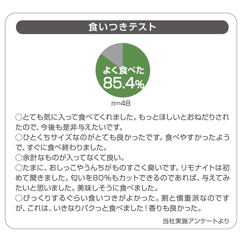 たん白質15.5%以上、脂質5.5%以上、粗繊維3.0%以下、灰分8.0%以下、水分30.0%以下、ナトリウム0.6g以下、カルシウム0.35%以上、リン0.28%以上、ビタミンA3