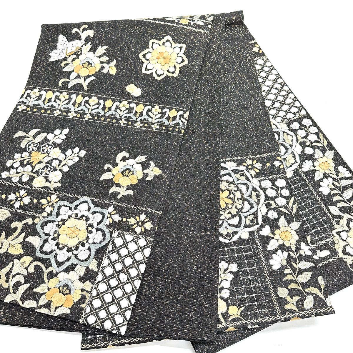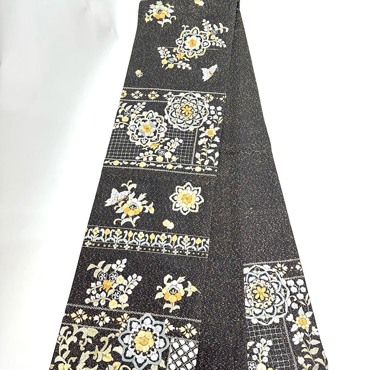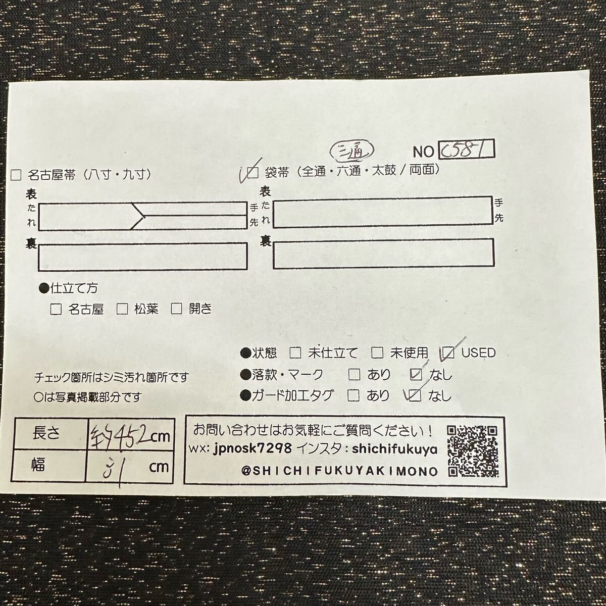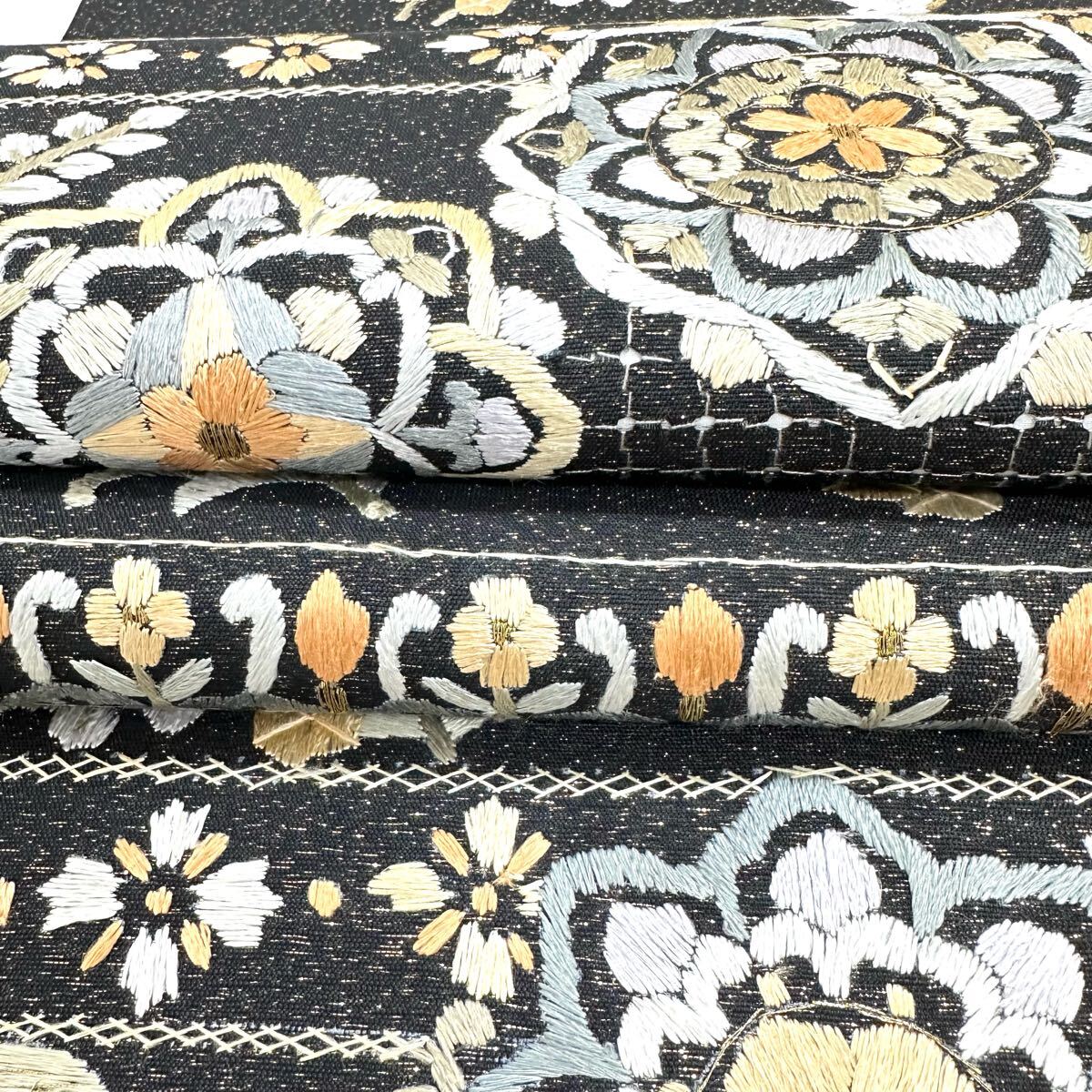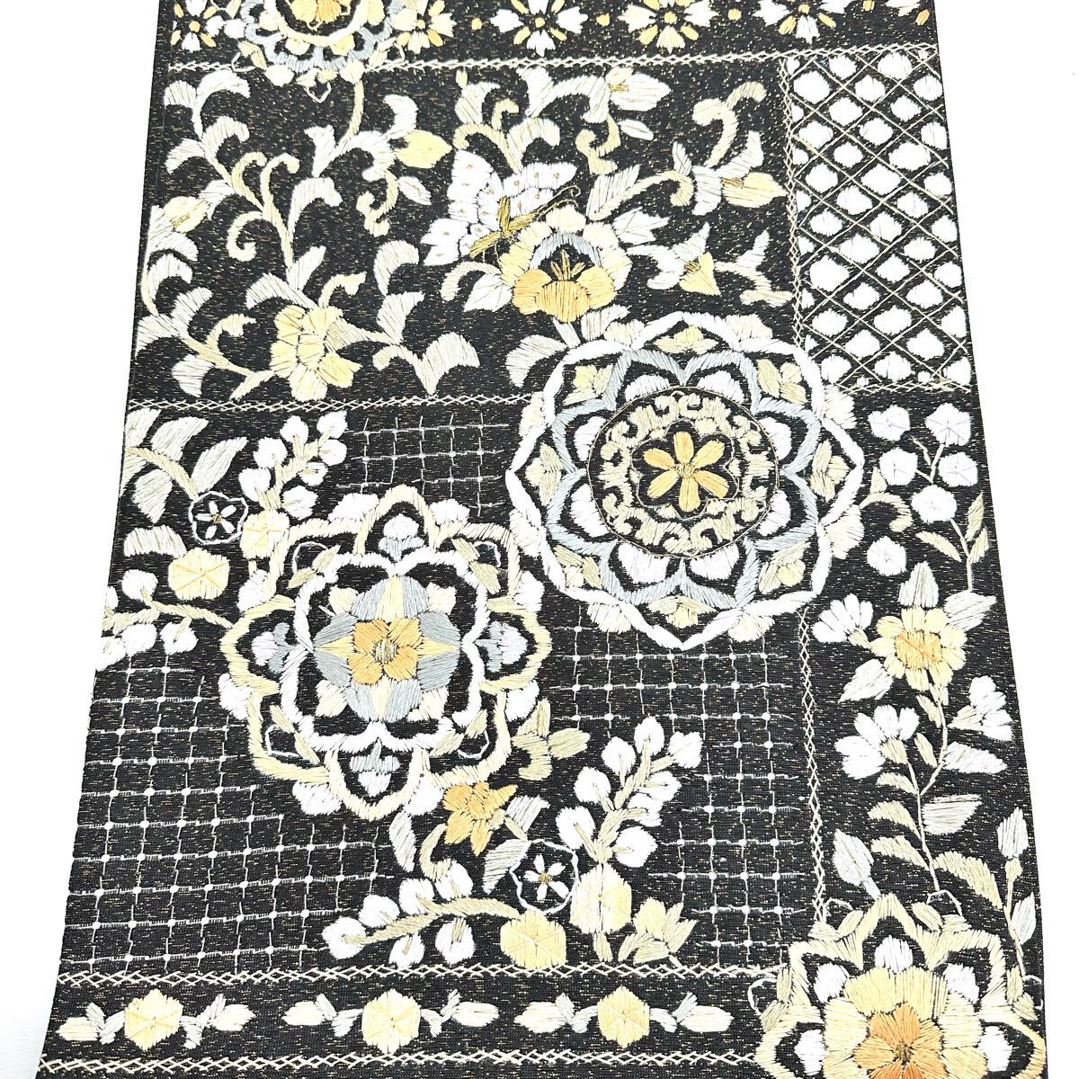 【七福】c581 逸品 高級品 正絹 袋帯 三通 華文 草花 蝶 金糸 銀糸 刺繍 豪華