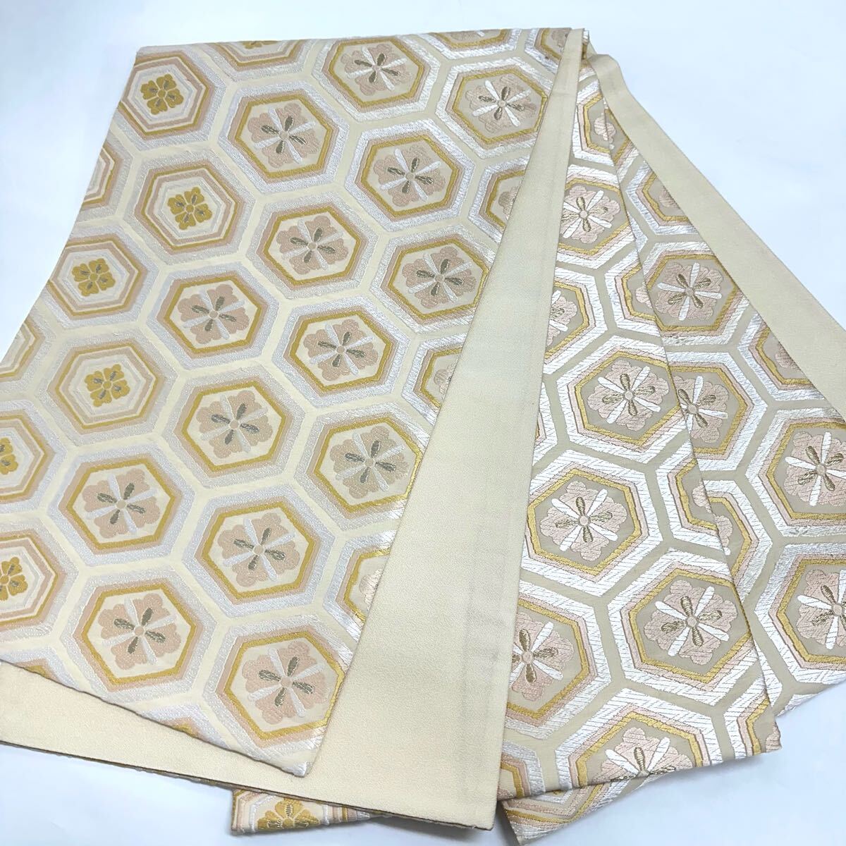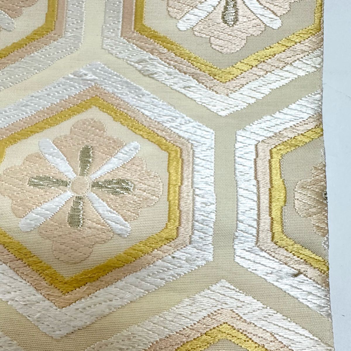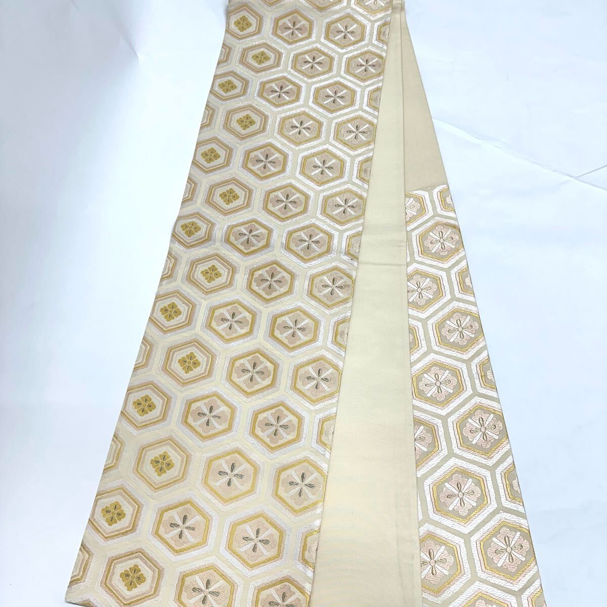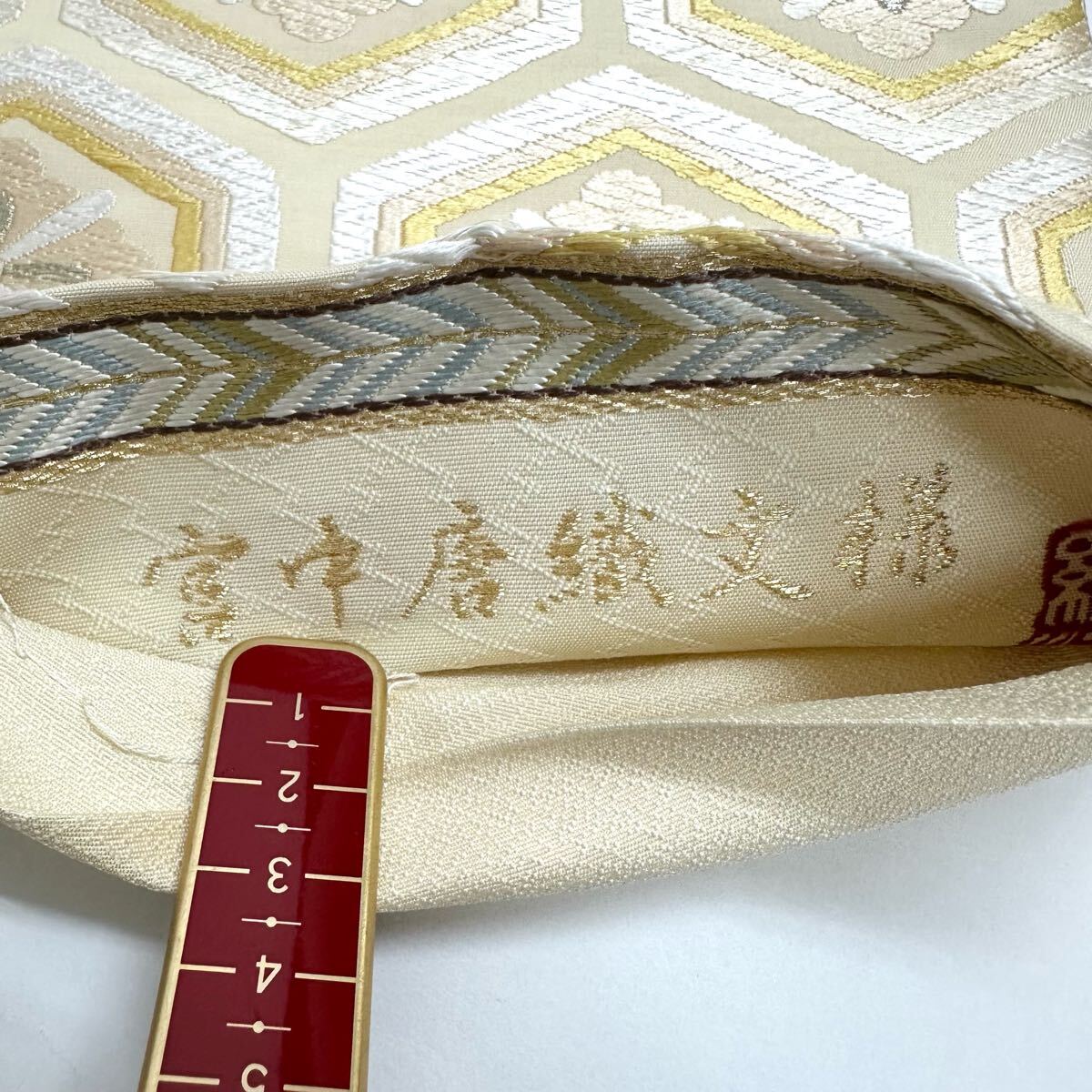 【七福】c580 逸品 高級品 正絹 袋帯 六通 亀甲 花菱 宮中唐織文様 落款あり 金糸 銀糸 刺繍 豪華