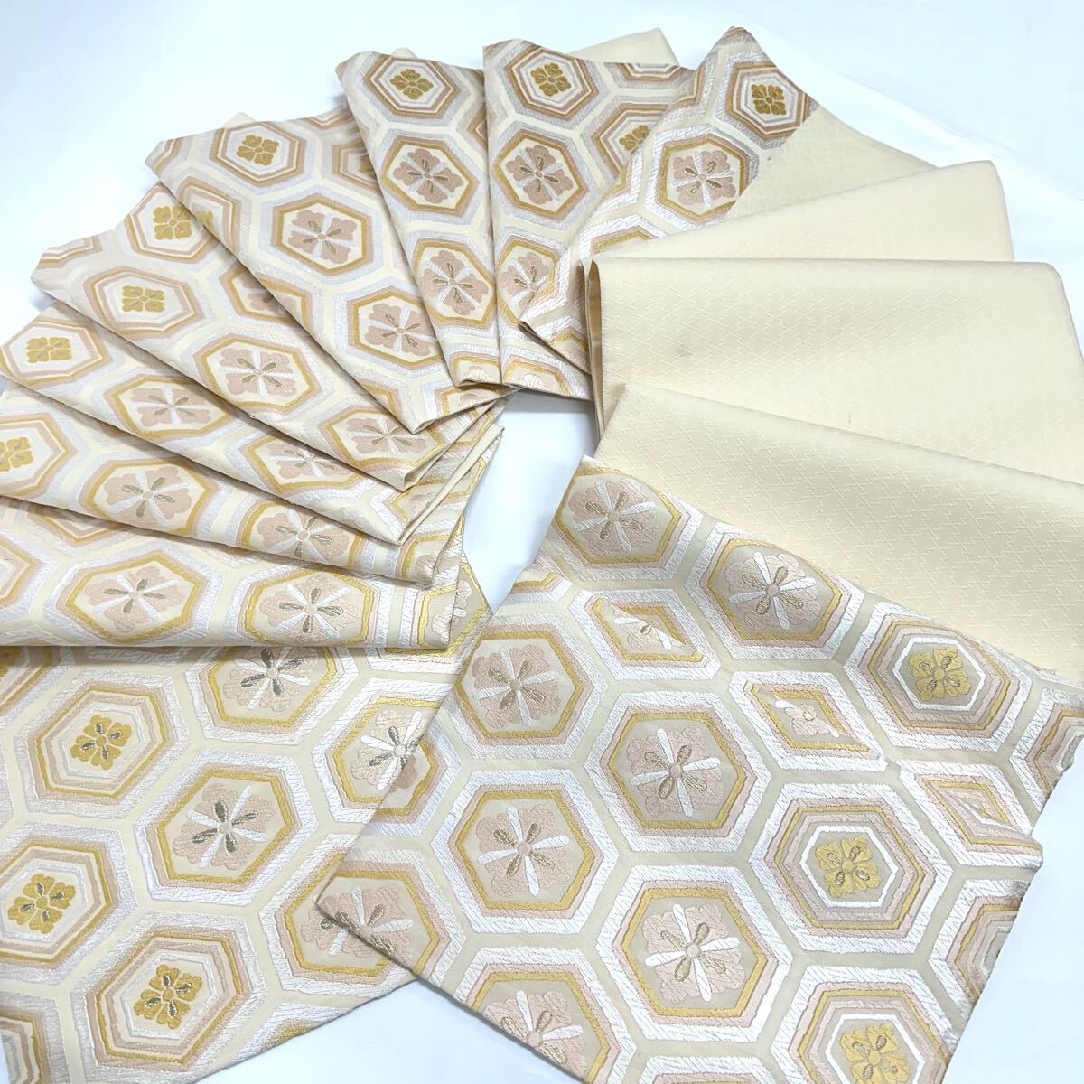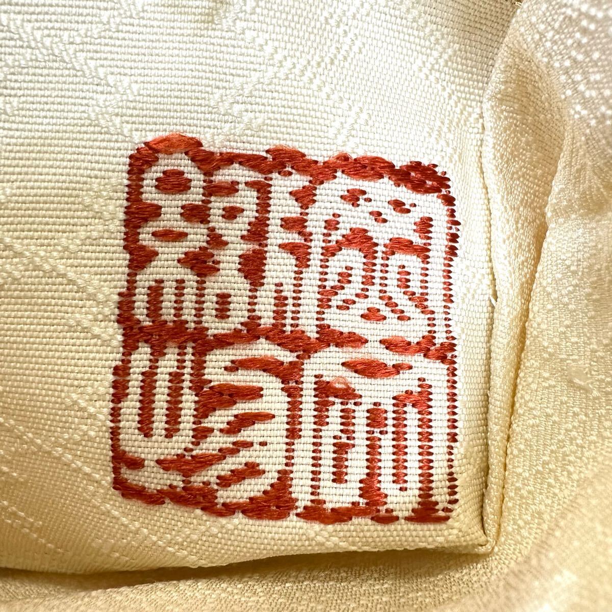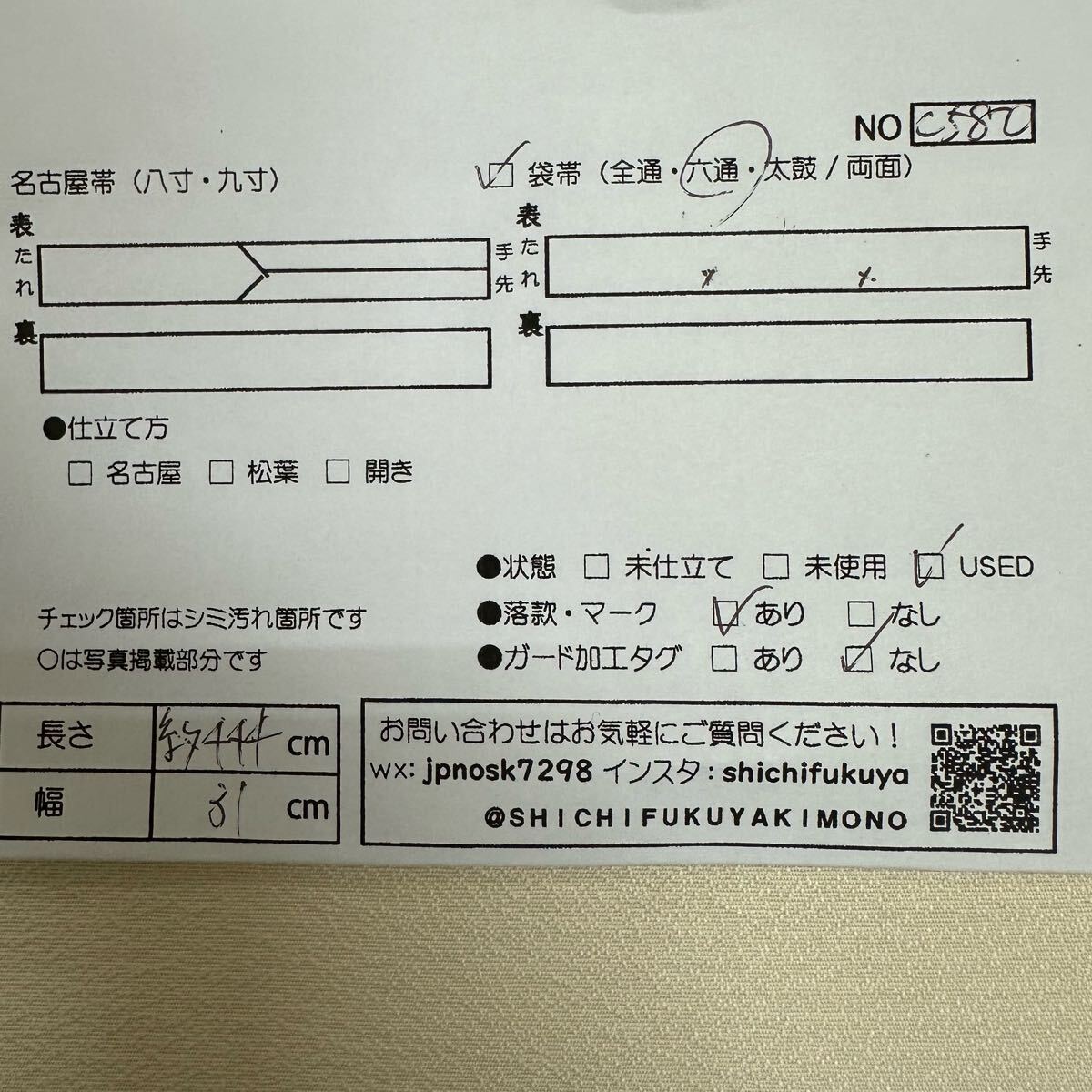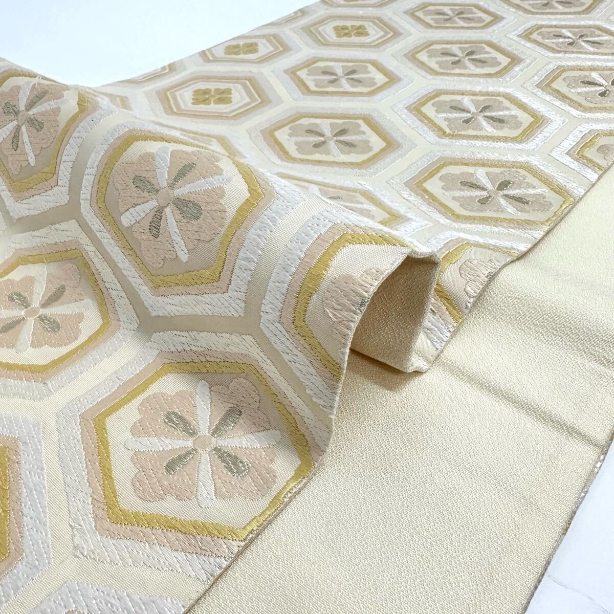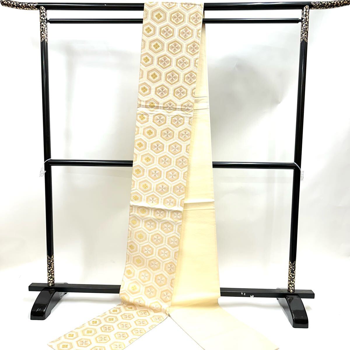 【七福】c580 逸品 高級品 正絹 袋帯 六通 亀甲 花菱 宮中唐織文様 落款あり 金糸 銀糸 刺繍 豪華