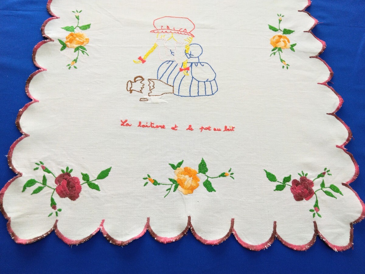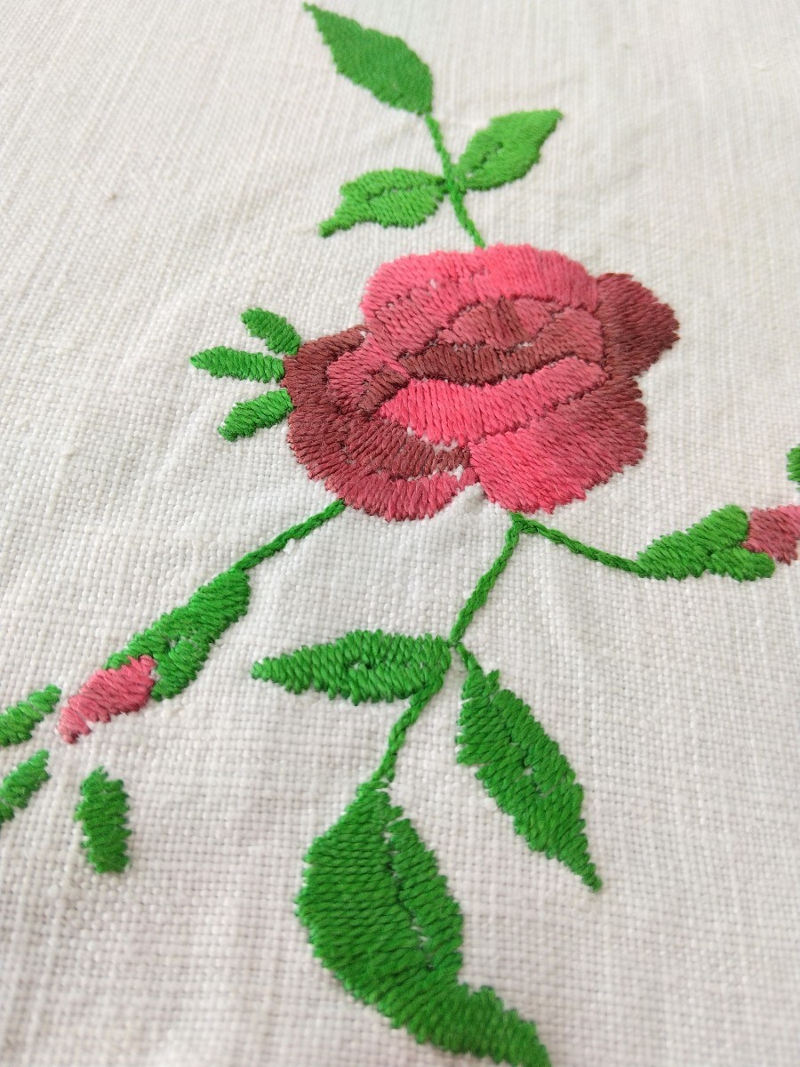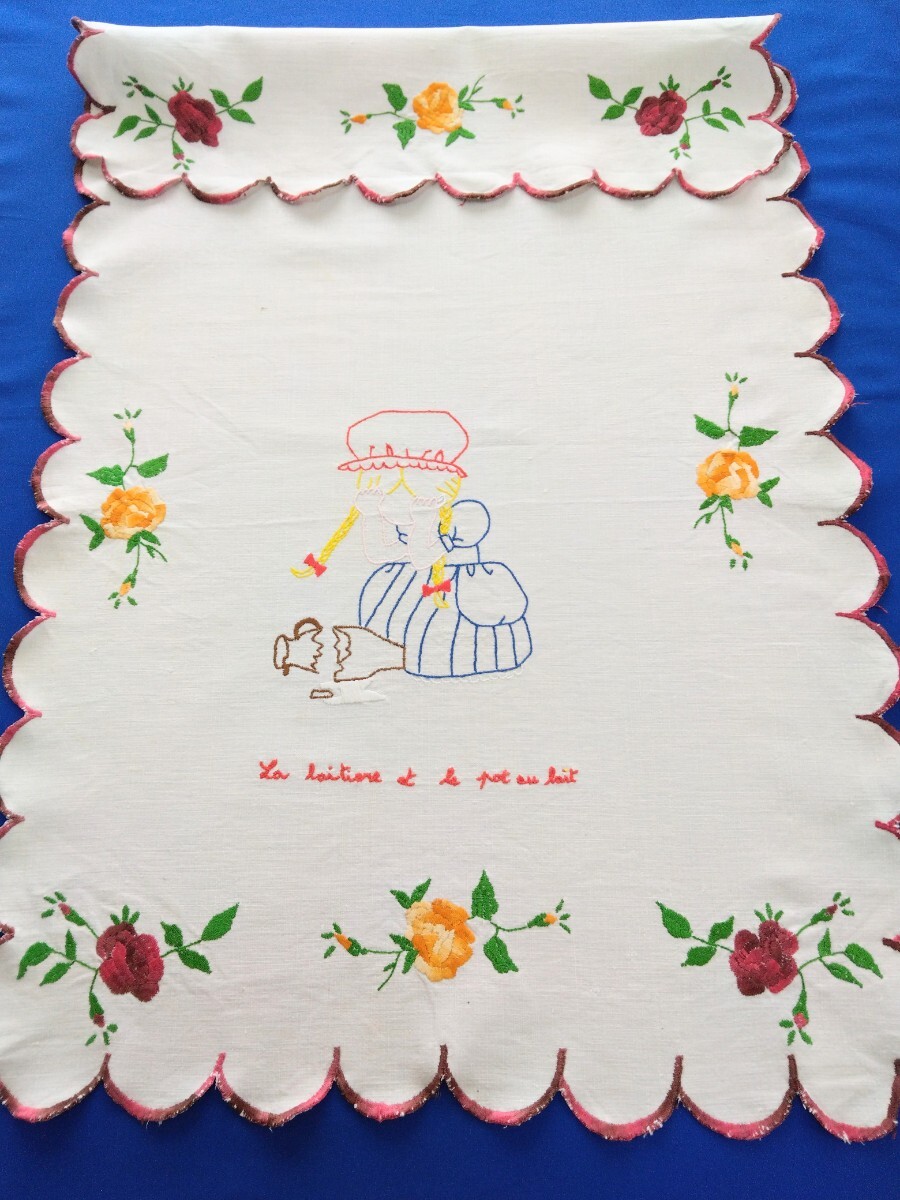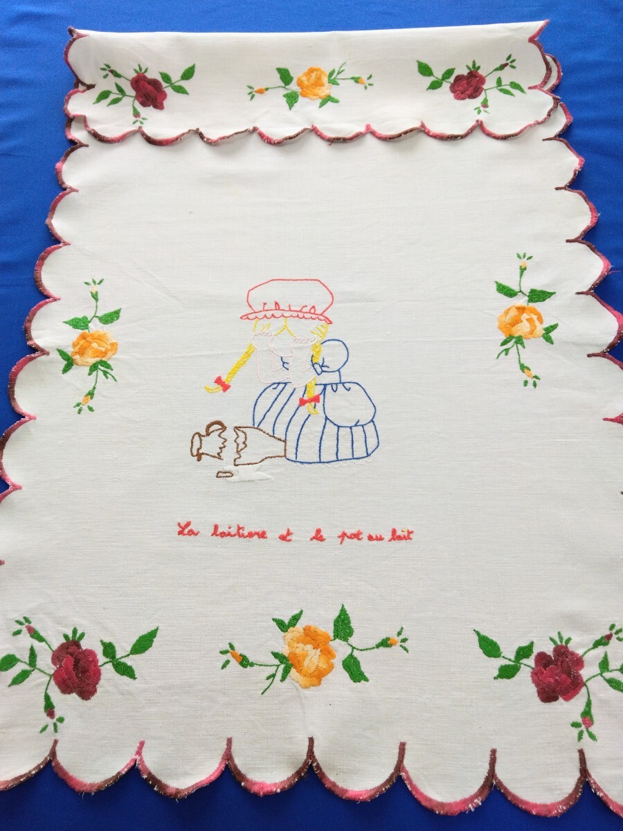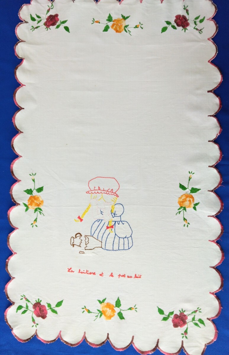 フランス蚤の市にて入手した麻生地に花瓶を壊してしまった可愛い女の子の手刺繍と鮮やかな薔薇の手刺繍をあしらった素敵なヴィンテージ目隠しクロス、カフェカーテン、飾り棚です。