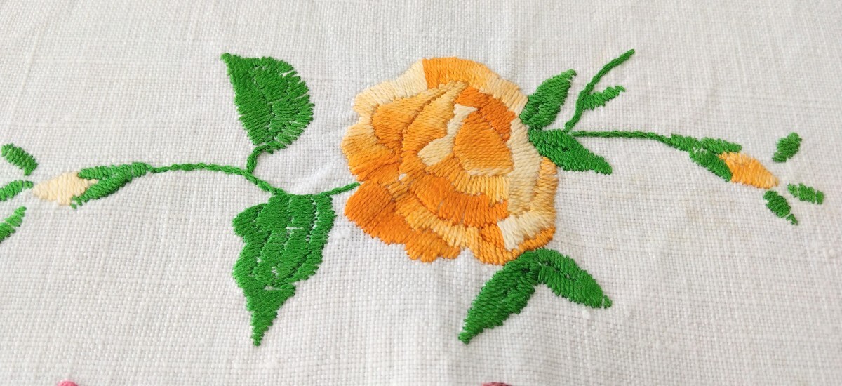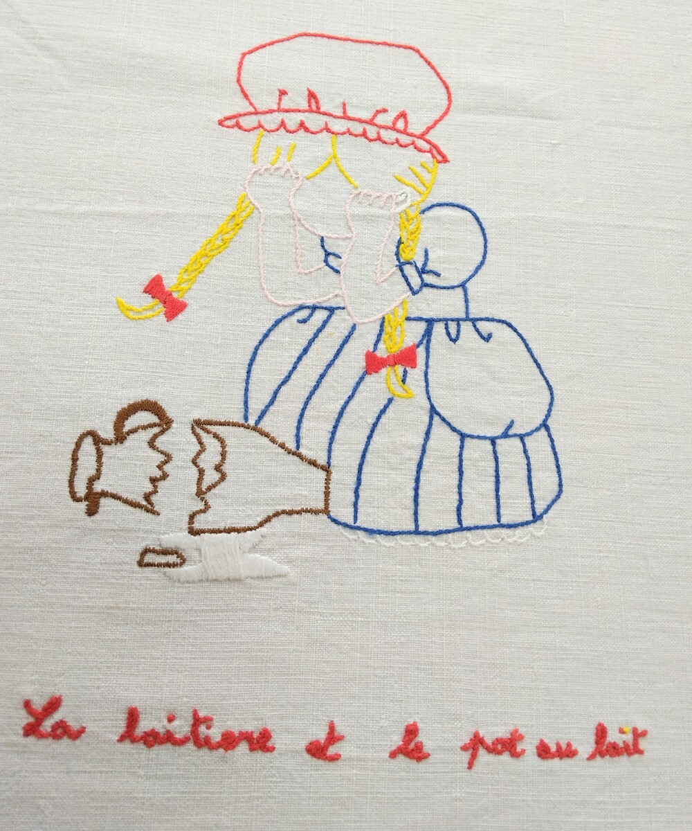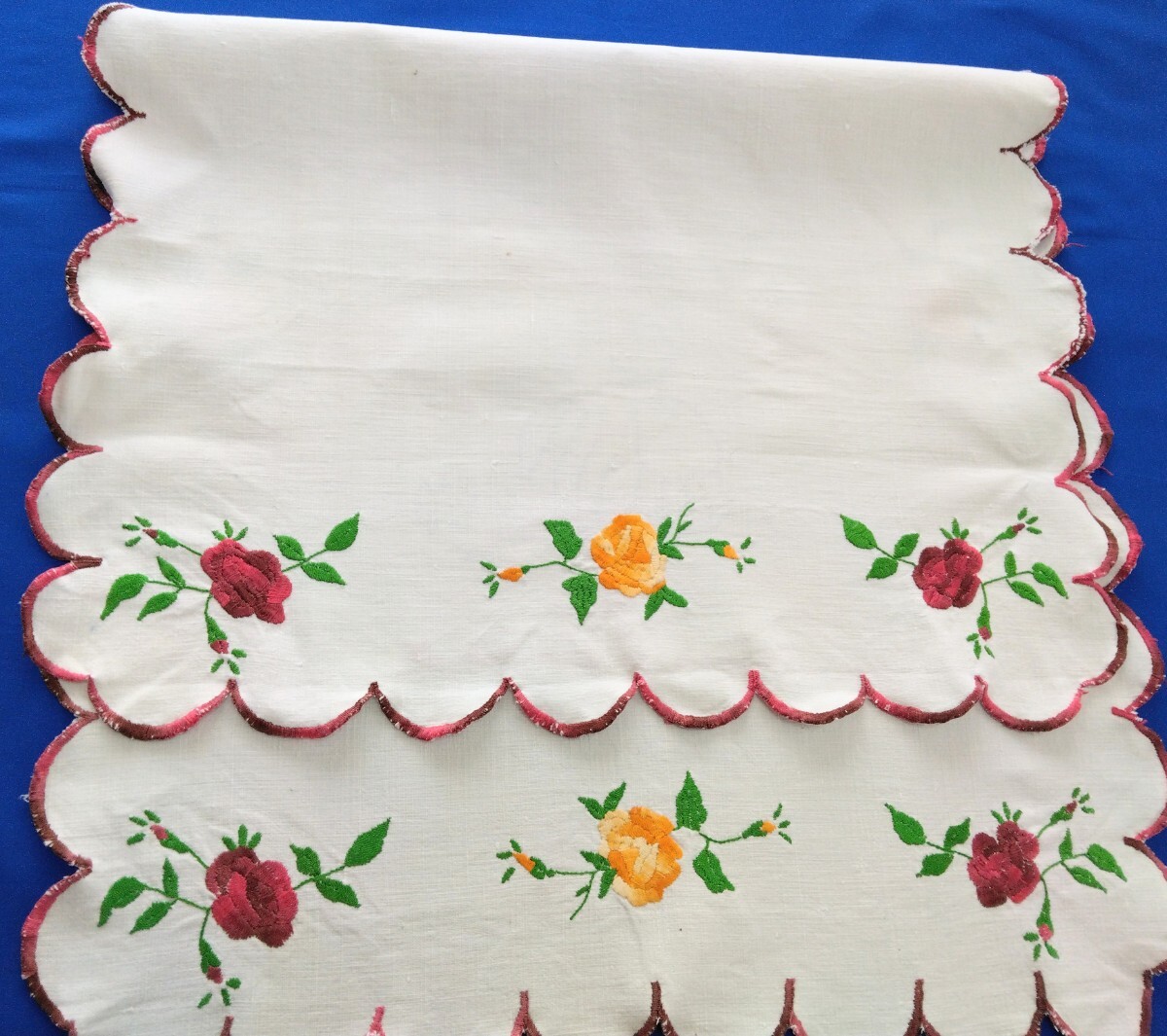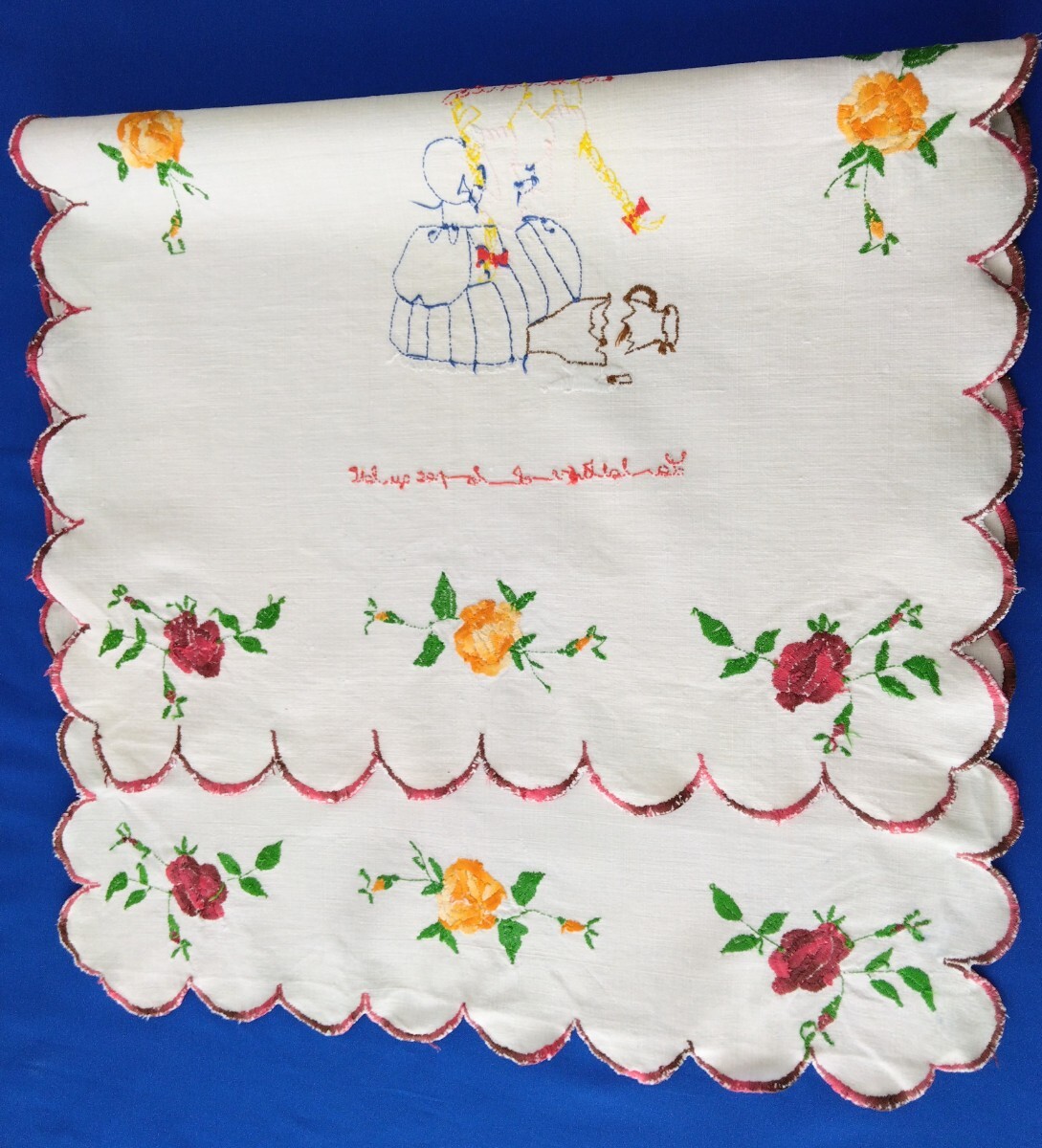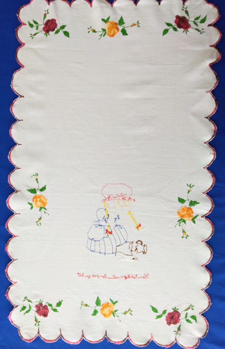 フランス蚤の市にて入手した麻生地に花瓶を壊してしまった可愛い女の子の手刺繍と鮮やかな薔薇の手刺繍をあしらった素敵なヴィンテージ目隠しクロス、カフェカーテン、飾り棚です。