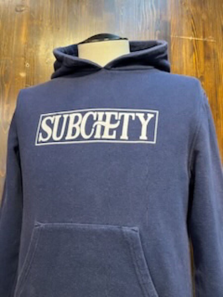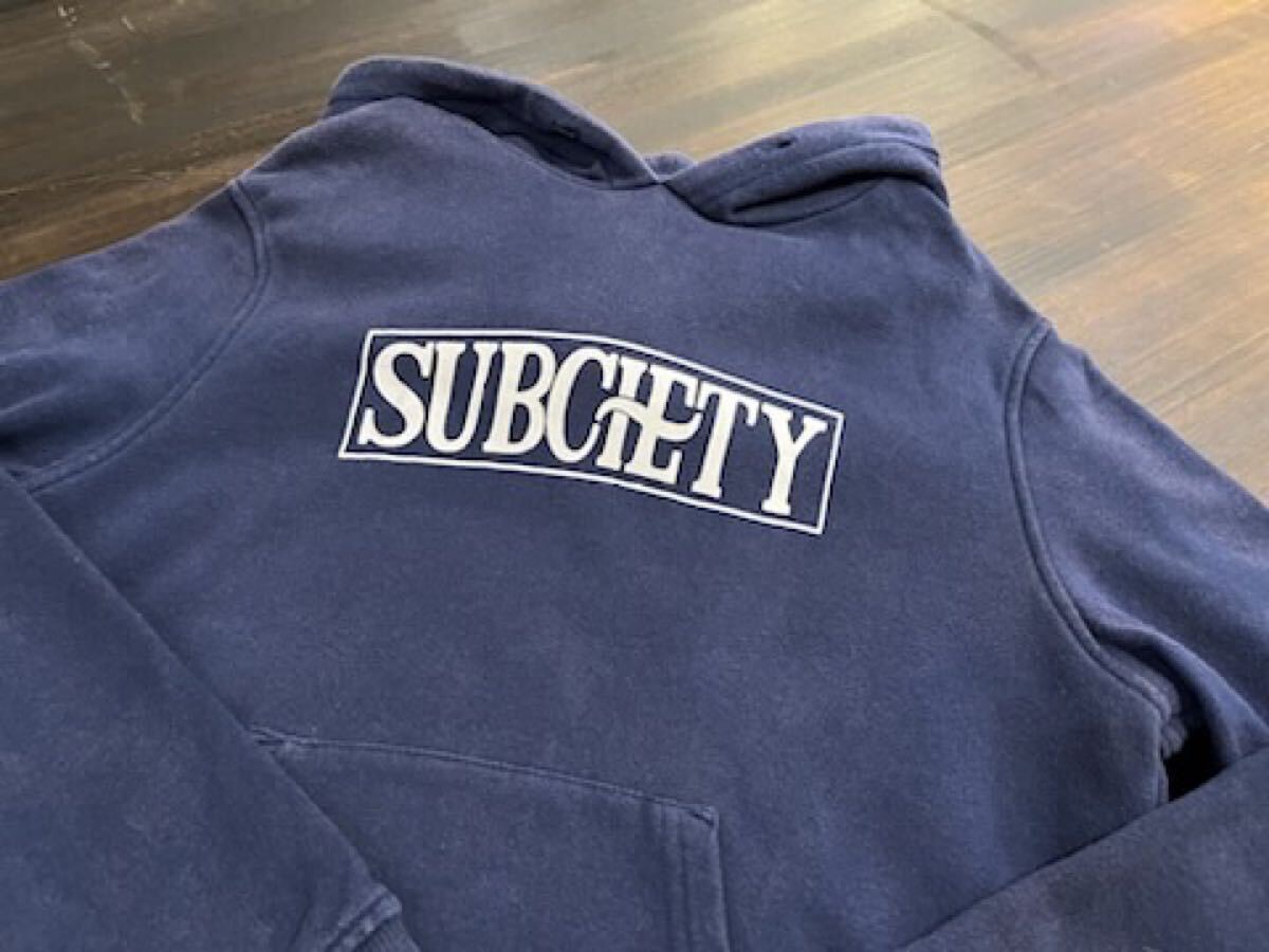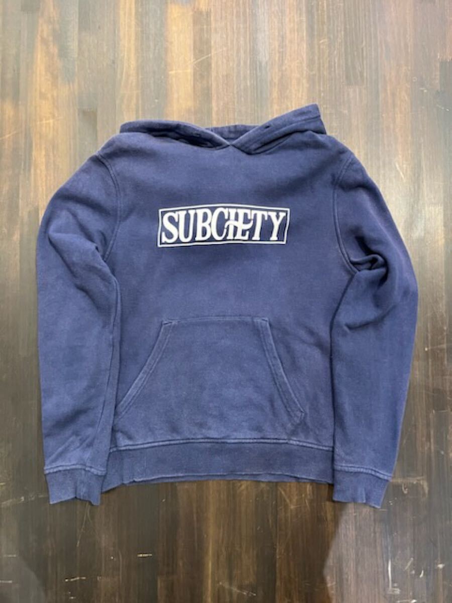 L466 メンズ パーカー subciety サブサエティー ネイビー ロゴ プリント プルオーバー フーディー ストリート ルード 古着 S (8)