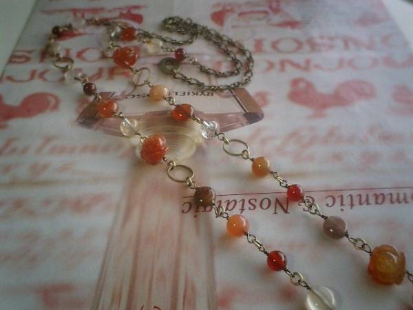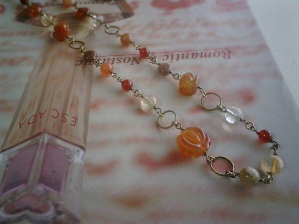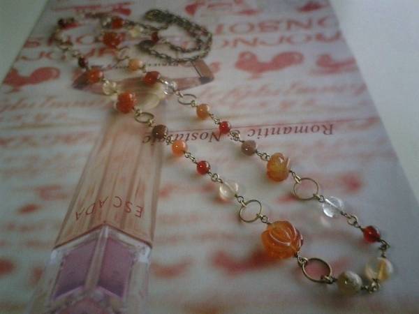 恋愛映画のレシピ・・シリーズです♪ベネチアの宝石箱・・ダークレッド、ダークオレンジのカーネリアンやルチルクォーツなど宝石仕様の繊細な石を集めたネックレスです♪8ミリのコイン、6ミリの丸玉のカーネリアン、8ミリの丸玉のルチルクォーツに12ミリから15ミリ位までの大きさ違いのカーネリアンの薔薇を散らして可憐な表情です♪長さは全長92センチ位で調節自由です♪2連にされても素敵です♪お揃いのネックレスやブレスレットも出品しています♪シンプルで飽きのこないいつまでも着けられるデザインを考えて作りました!ハンドメイドをご理解頂いてノークレーム、ノーリターンでお願いします