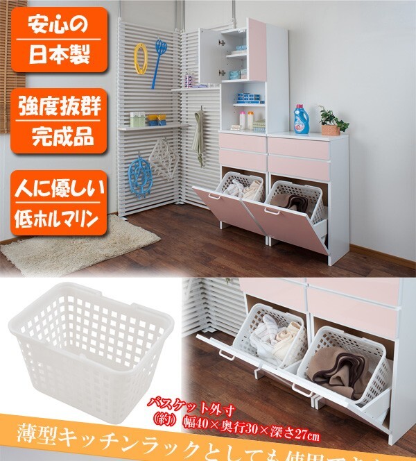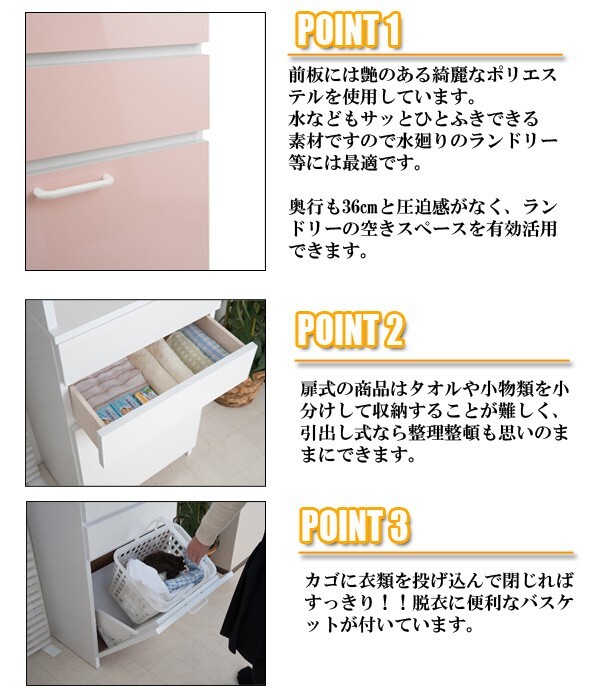 ◇奥行も36cmと圧迫感がなく、ランドリーの空きスペースを有効活用できます。脱衣に便利なバスケットが付き。またキッチン収納でバスケットをゴミ箱使いとしてもGOOD!