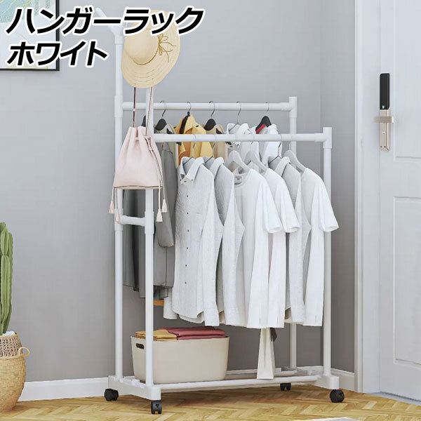 ハンガーラック ホワイト ダブルハンガータイプ ポール付き キャスター付き コートや帽子、鞄をサッとかけられる AP-UJ1129-WH