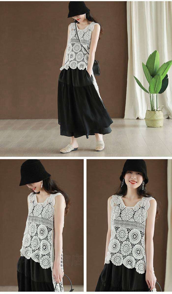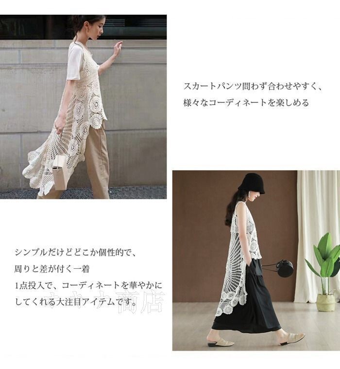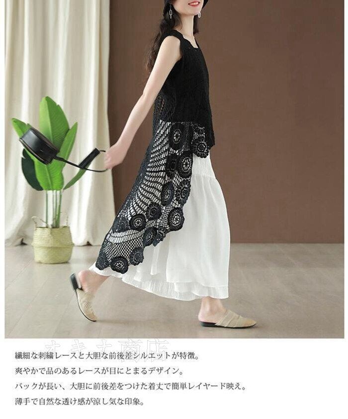 レース ベスト ノースリーブ 花柄 刺繍 後ろ長め 重ね着 不規則 ニット ジレ トップス 羽織り ロングベスト 総柄 透かし編み 個性的 タンクトップ レディース ゆったり コーデ 着痩せ 海 カーディガン 前後違い 春夏 秋 お呼ばれ 休み 旅行