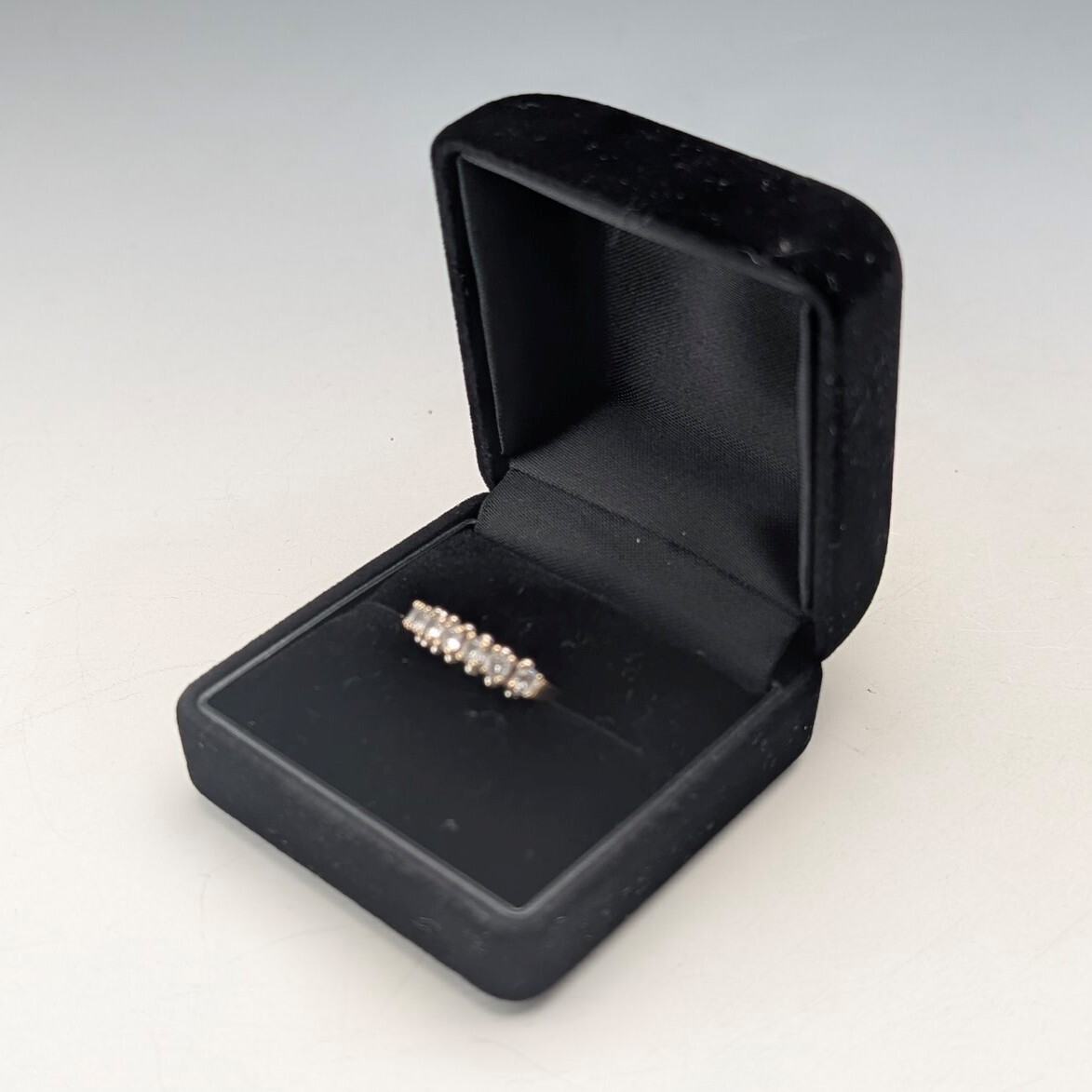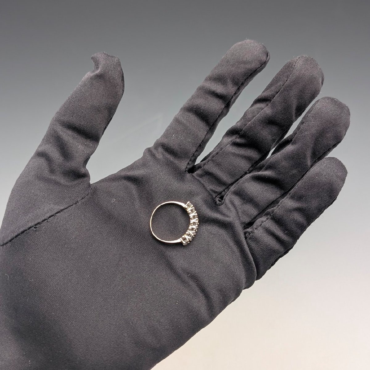 無色の小さなスピネルが7個並べられた、ハーフエタニティリングのようなデザインとなっています。