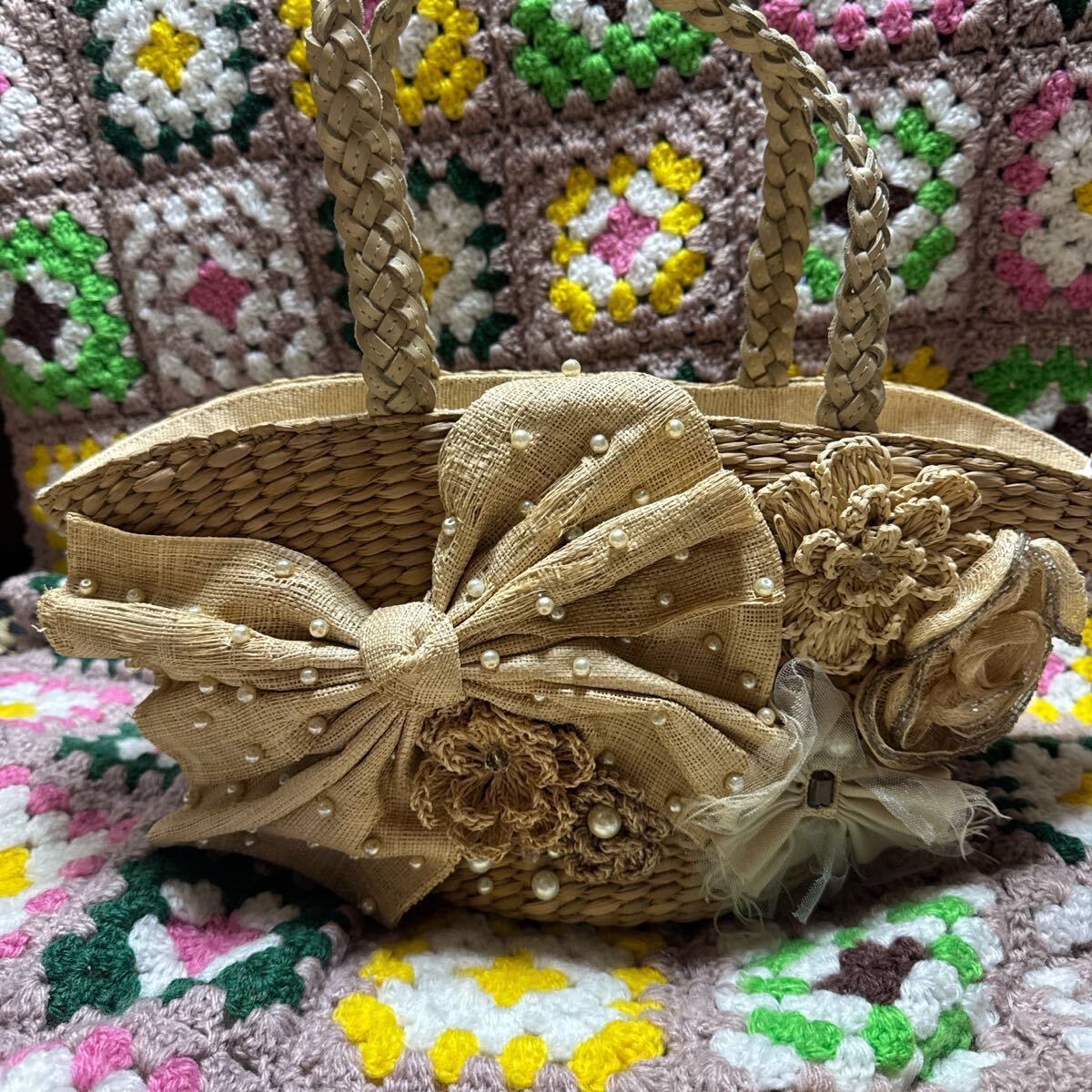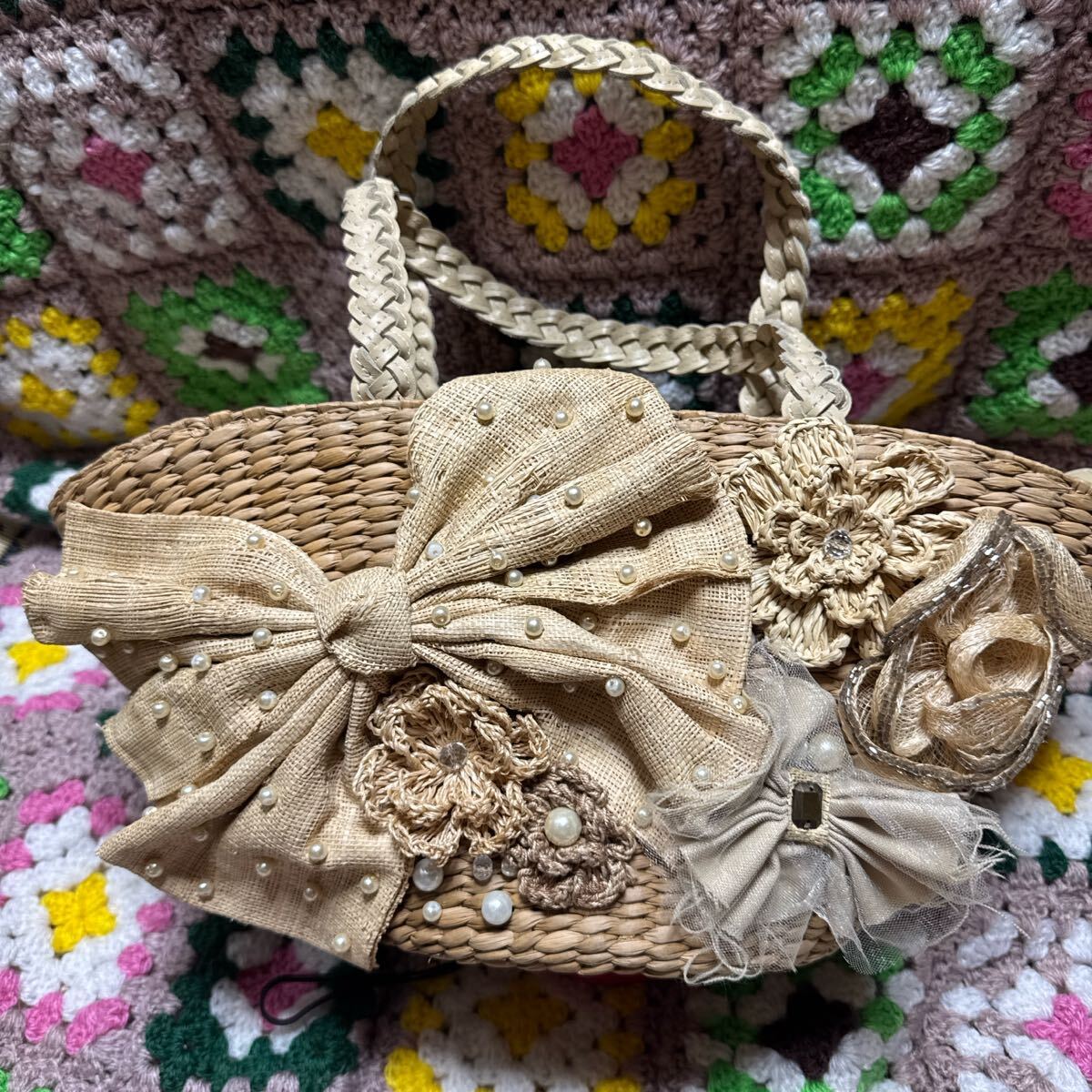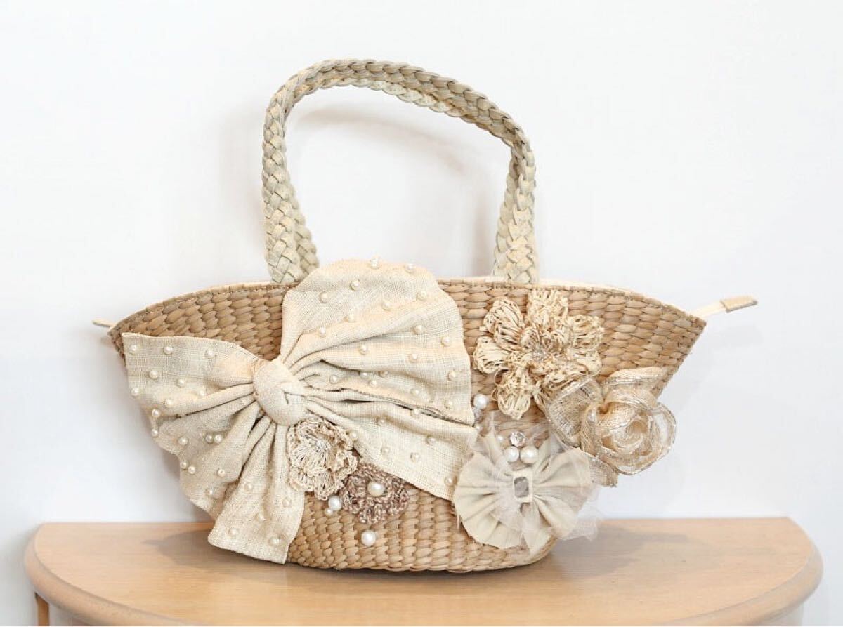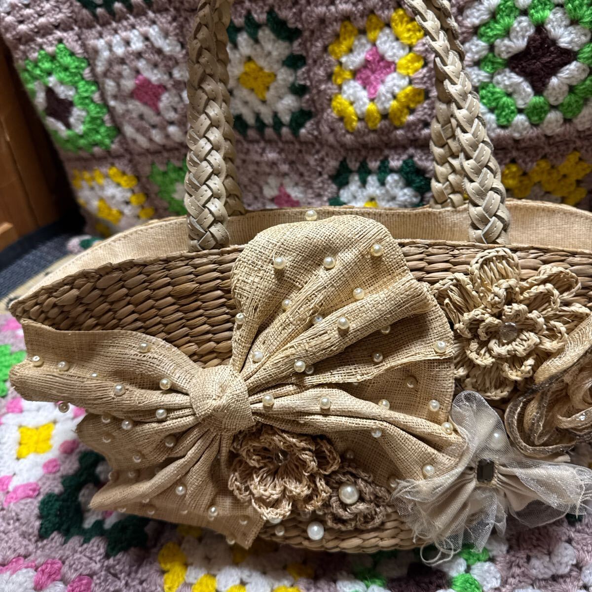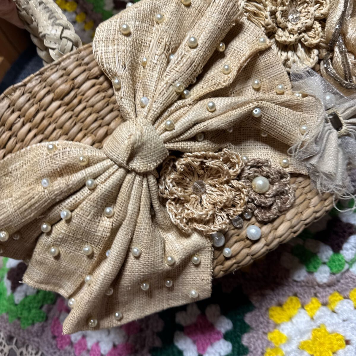 リボンとパールの装飾が特徴的なベージュのかごバッグ。