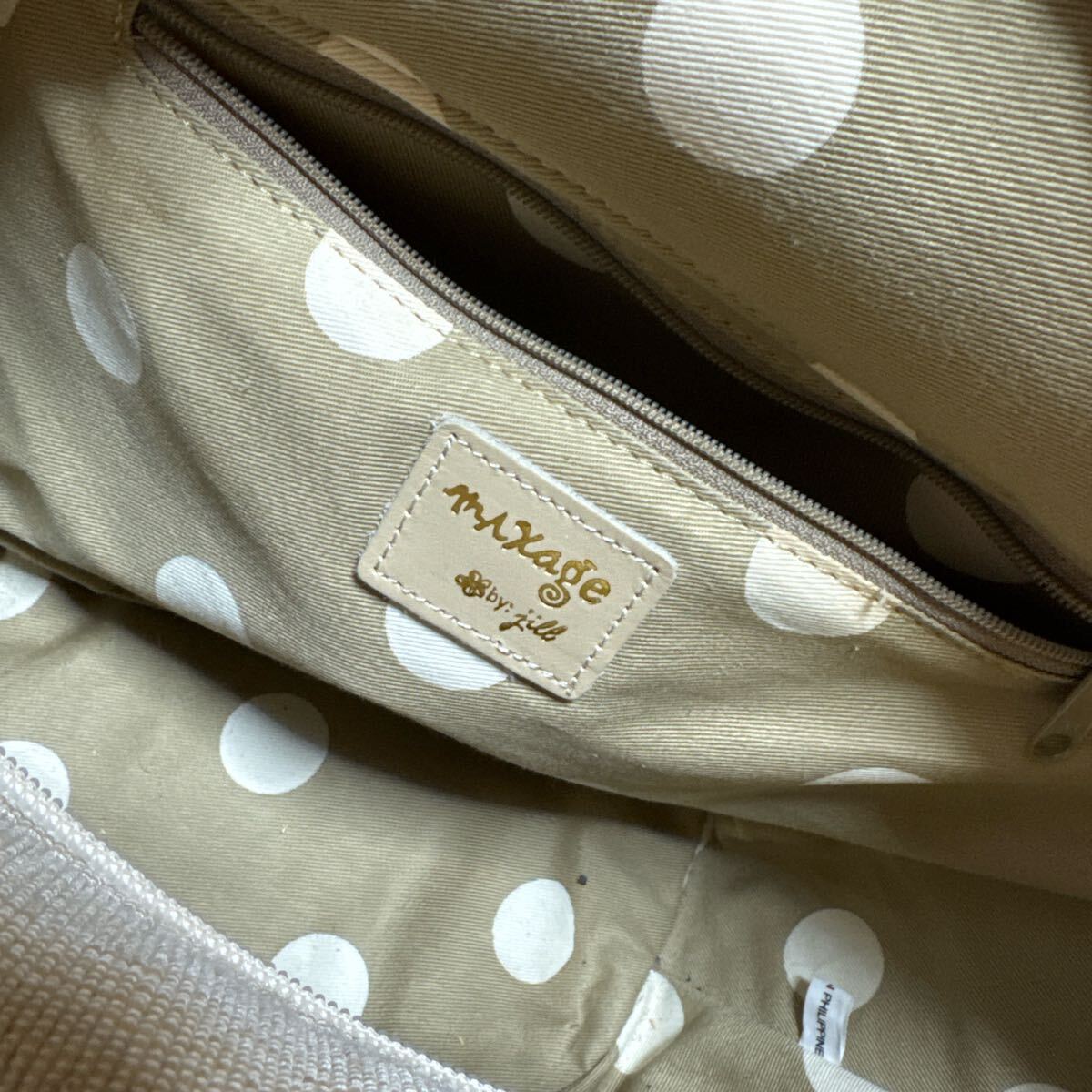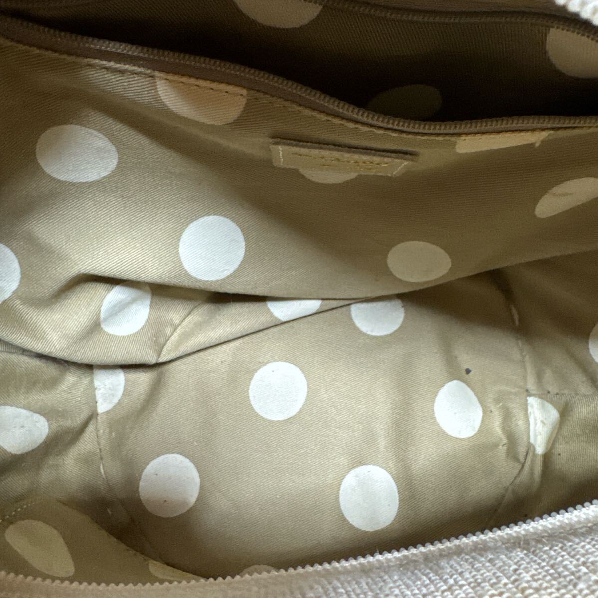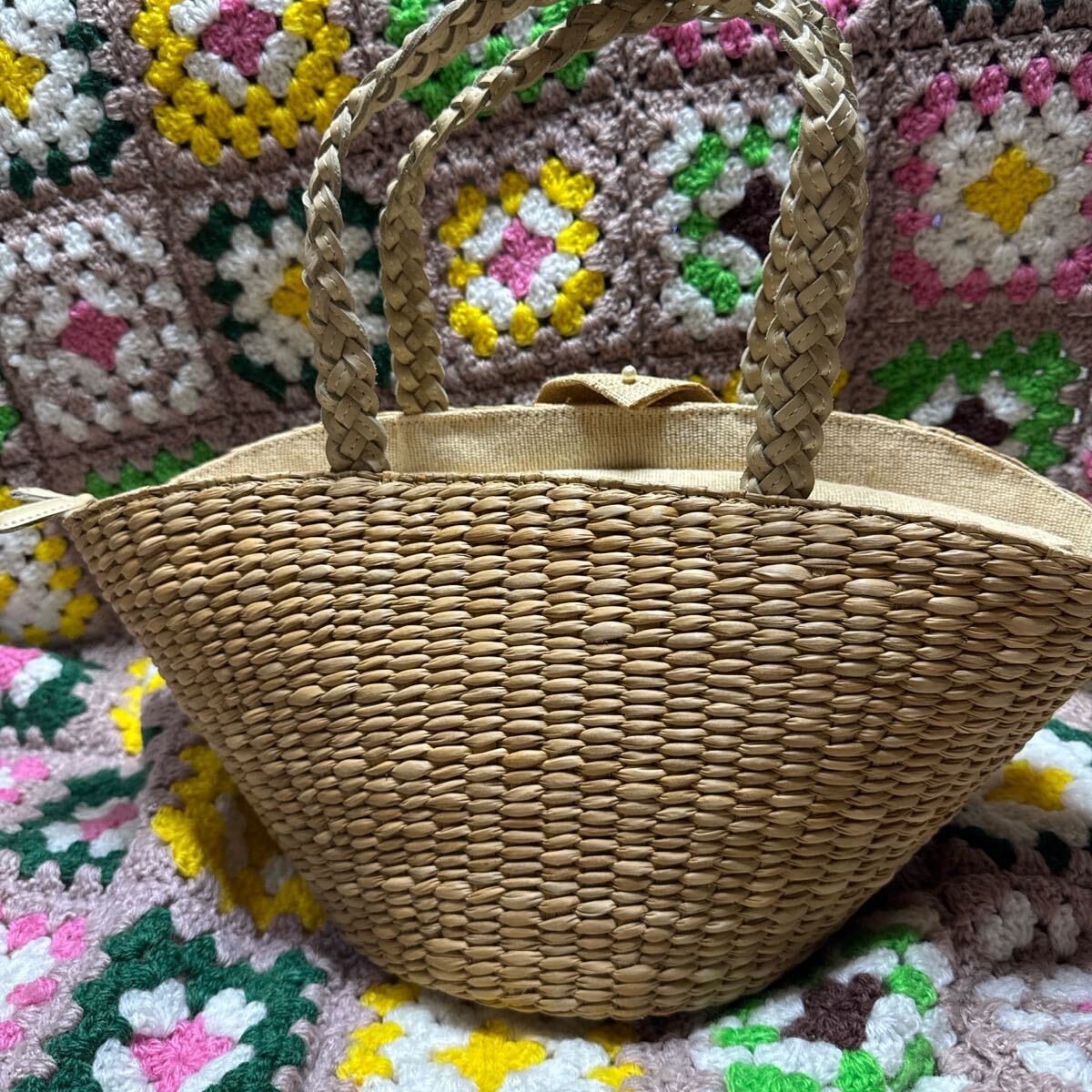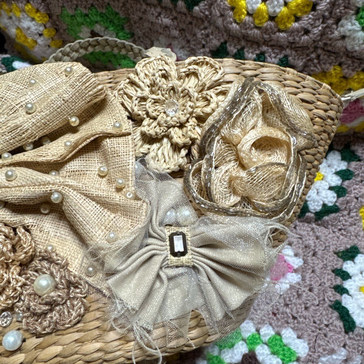リボンとパールの装飾が特徴的なベージュのかごバッグ。