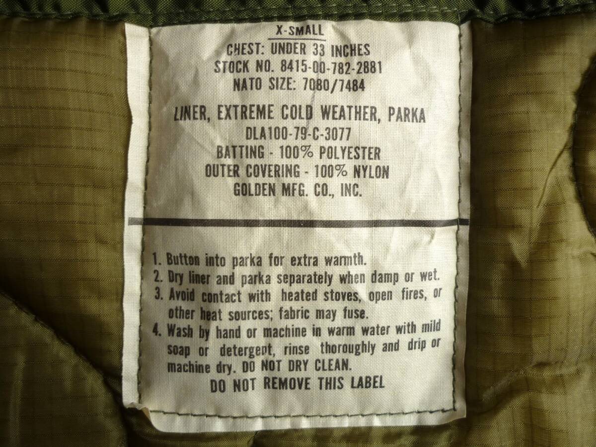 ライナーはこのパーカーと組み合わせた状態で保管されていた未使用品、フードのワイヤーは撮影の為に最低限だけ広げ、製造、軍納入時の折り畳まれた元の状態に戻してあります。