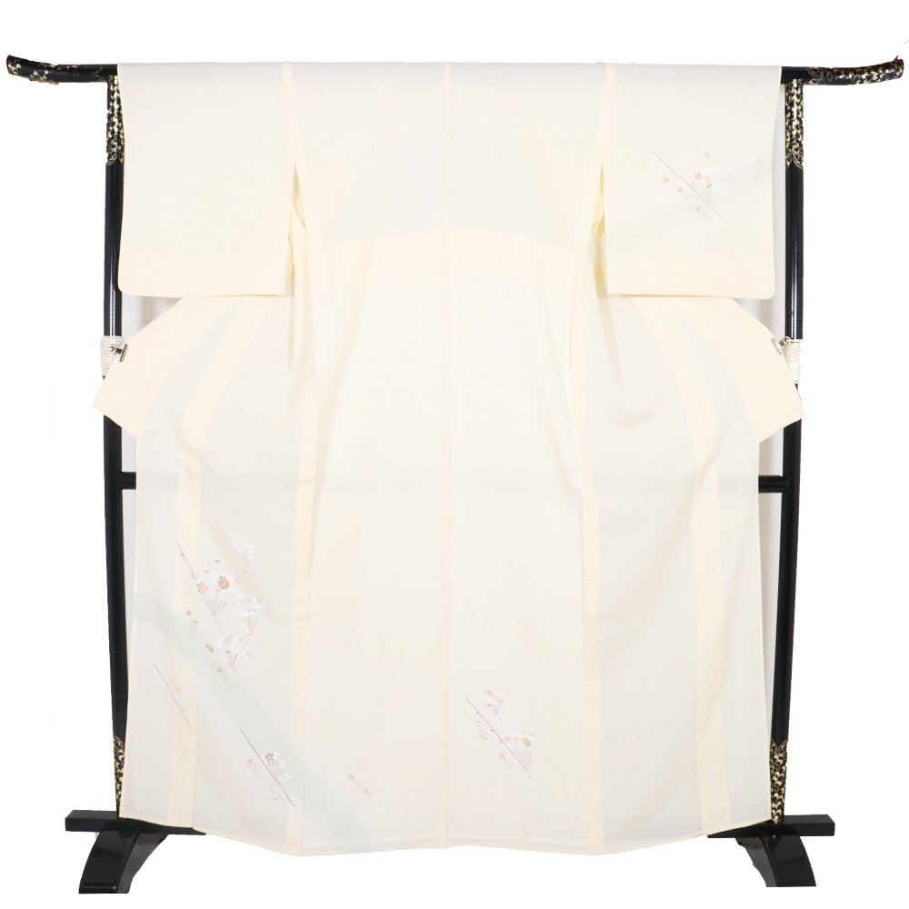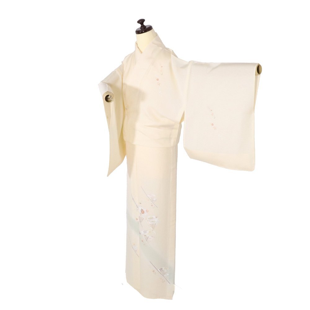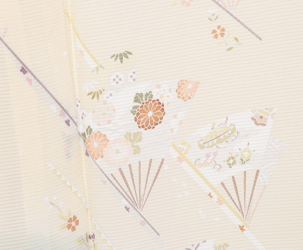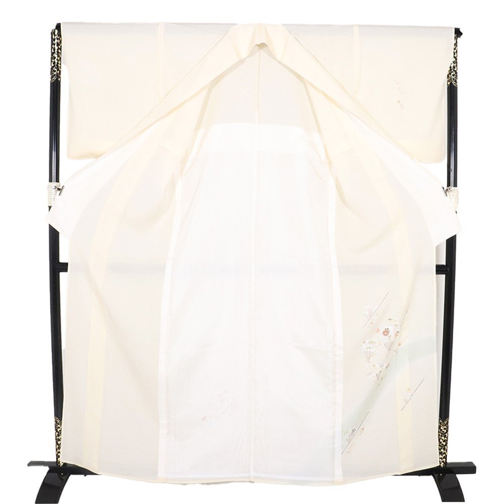 | 絽 京友禅 訪問着 壺金生地 ベージュ・緑・霞暈し地 花扇子 松竹梅・菊・撫子 169 広襟 居敷当て付き 新品 しつけ付き | |