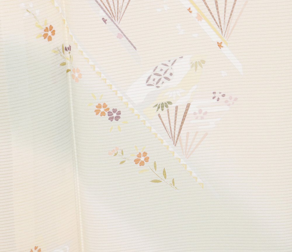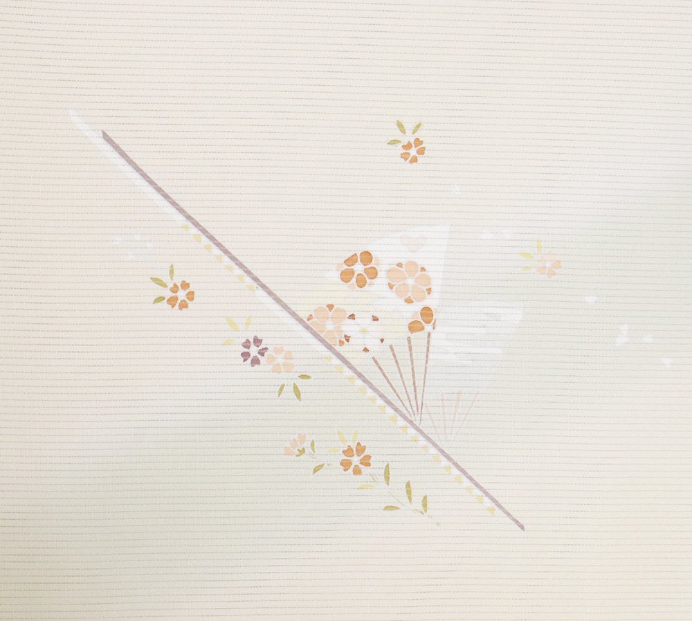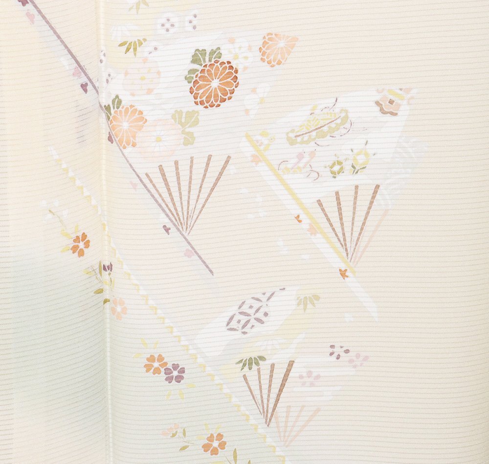 | 色・柄 | 絽 京友禅 訪問着 壺金生地 ベージュ・緑・霞暈し地 花扇子 松竹梅・菊・撫子 (写真では上手く色が出ない場合があります。ご了承下さい) |