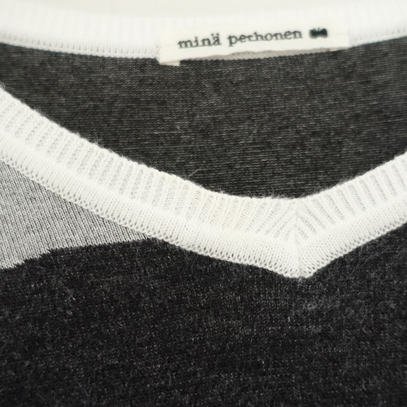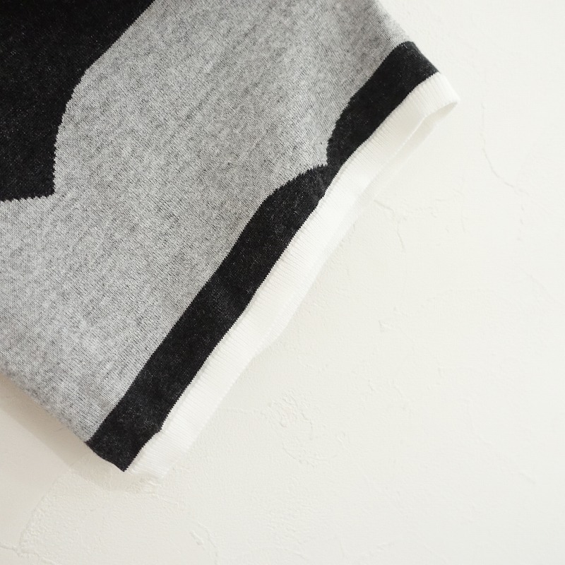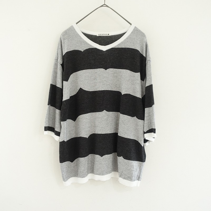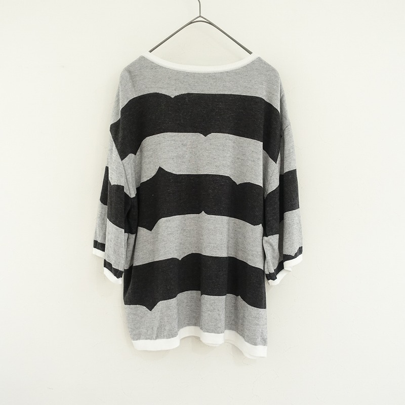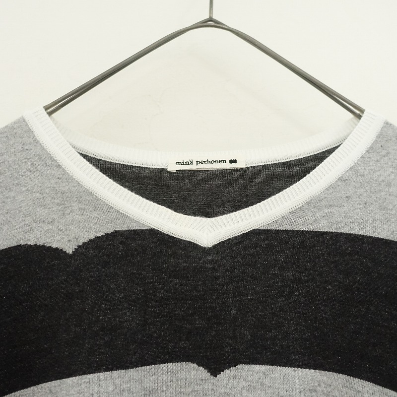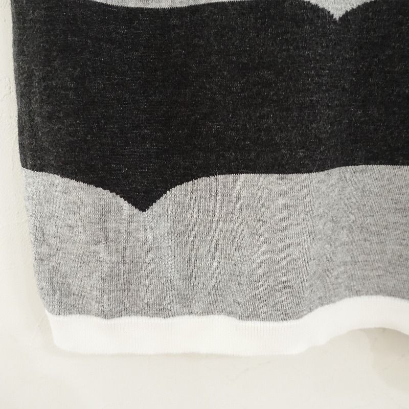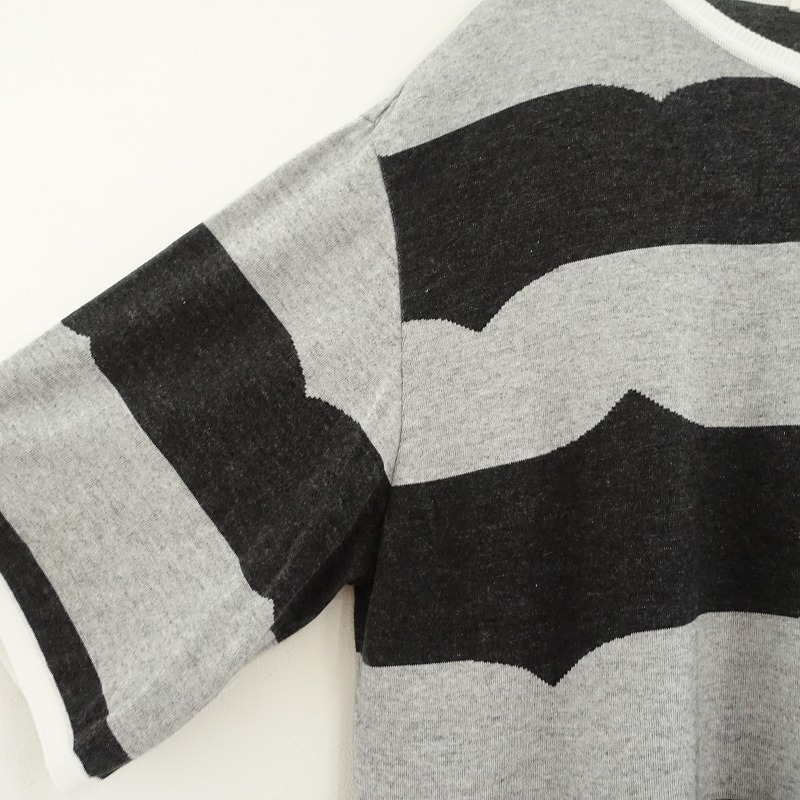 2024年春夏コレクション mina perhonenのlittle wave ボーダー風ニットプルオーバーです。カラーはスミクロ×杢グレーのボーダー風で、薄手の綿ニット地です。プルオーバータイプで着脱でき、ネック・袖口・裾はホワイトのリブ仕様です。 |