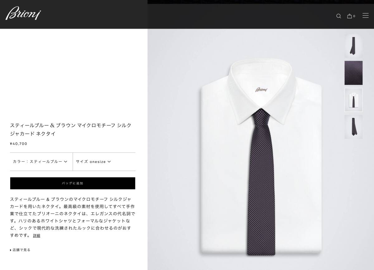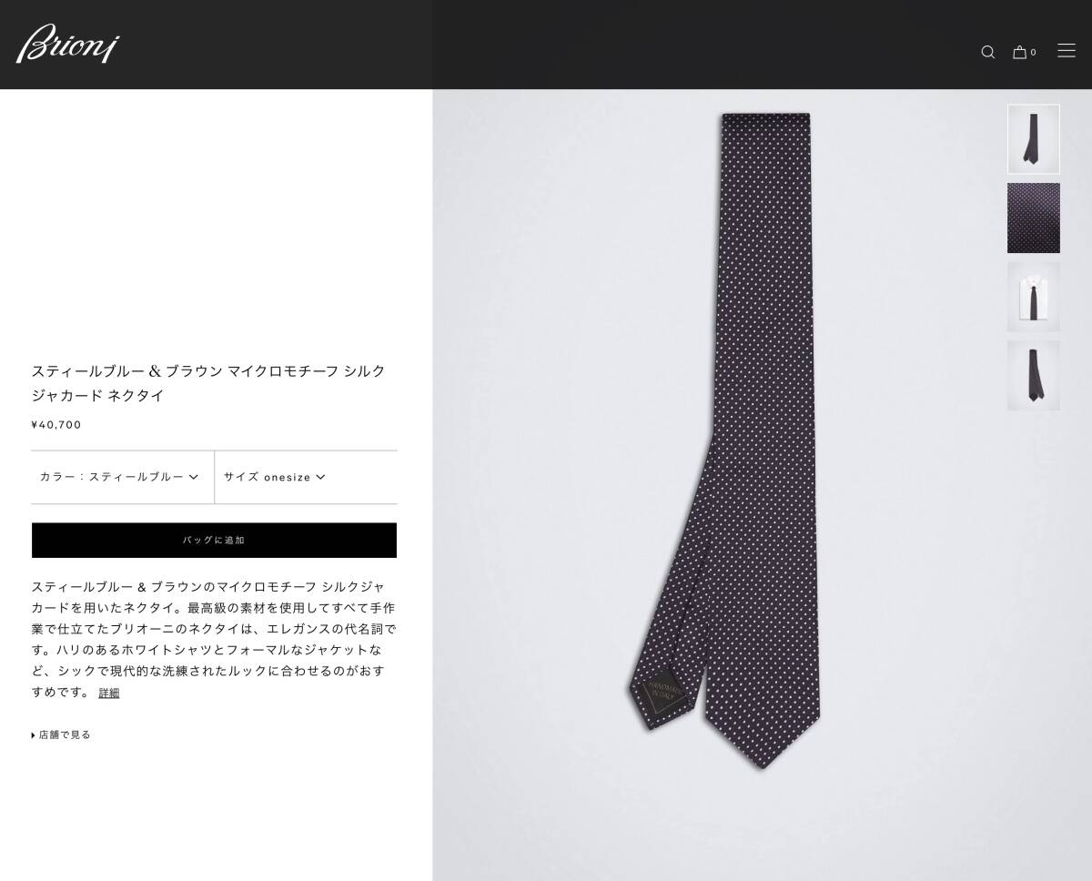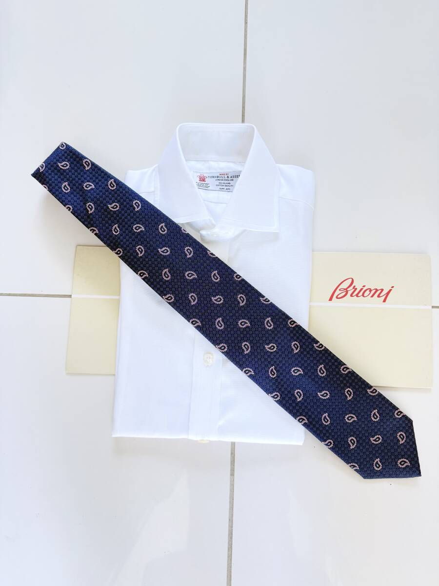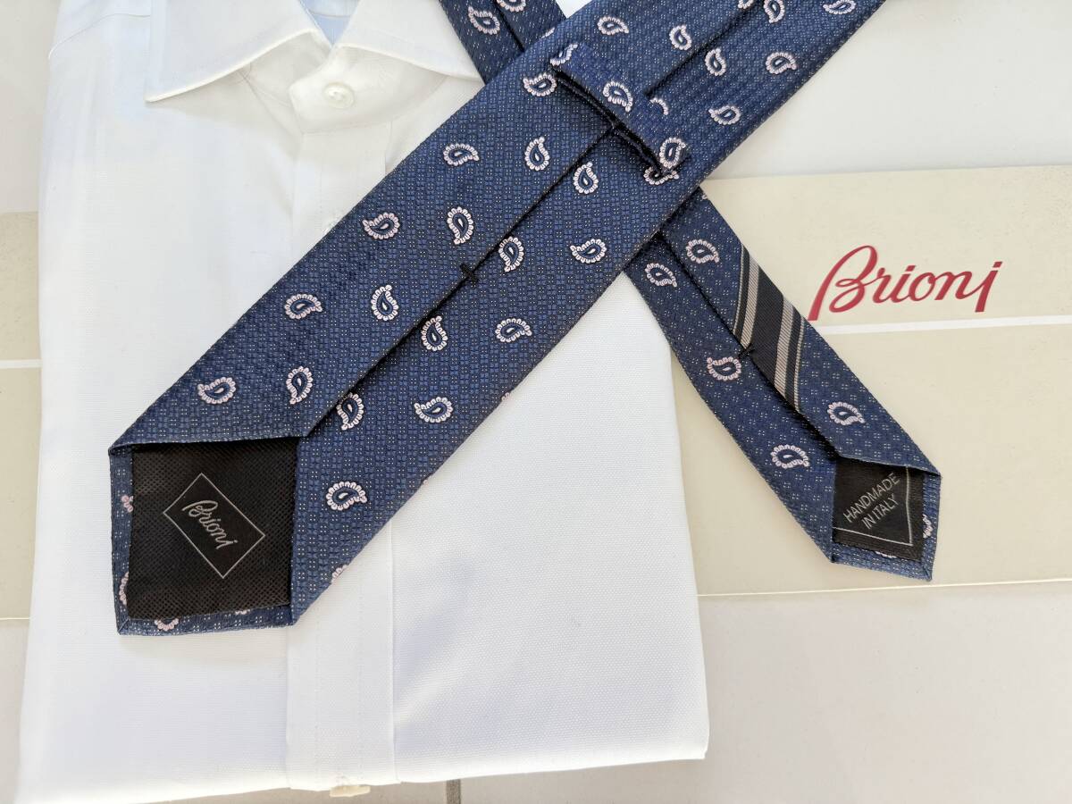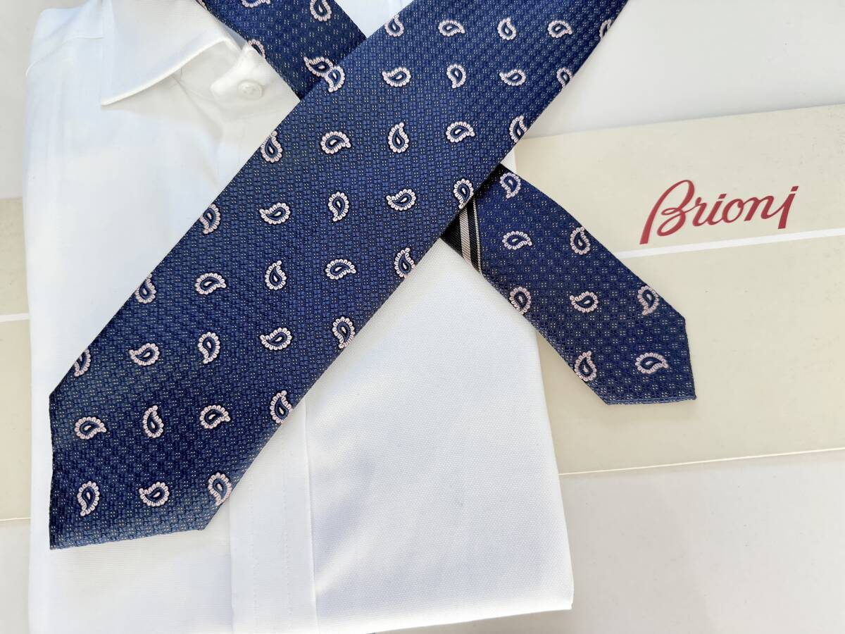 ブリオーニの標準サイズである幅のモダンでエレガントな質感です。私も数本使っているのですが、この柔らかなシルク生地はとにかく軽めで首がこりません。これまでの××フォールド、のようなものもよいのですが、近頃はそうしたブームも一段落し、クラシックな方向へとトレンドが変化しております。出品者も何本かは持っております。価格は国内定価が3万7,000円から4万0,700円へと値段が上がりましたが、半額以下のスタートです。br> カラーはビジネス向けの王道アイテム、エレガントな ネイビーにアズーロのペイズリー。素晴らしい目の細かさと結び心地です。これからの季節に是非どうぞ。参考画像もあげておきます。