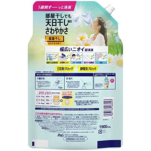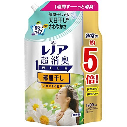 「レノア 超消臭1WEEK 柔軟剤 部屋干し おひさまの香り 詰め替え 大容量 1900mL」▼4987176168023▼(商品説明)・ 1900mL ・・PatternName:旧)部屋干し おひさまの香り 詰め替え 1900mL・レノア超消臭1weekは、汗をかいた時のニオイはもちろん、ベタつきまで防げるようになりました(*1)。汗をかいてもさらっと吸収して速乾(*1)。しかも、何度汗をかいてもニオイ0へ(*2) *1 自社他柔軟剤と比較。 *2 柔軟剤未使用と比較。すべてのニオイを0にするわけではありません。・レノア超消臭1WEEKは、80%以上の消費者が実感した、1週間ずーっと続く消臭力(*1)。 かけっぱなしの洗面所のタオルや、ニオイが気になるけれど毎日は洗えない、シーツや枕カバーまで、1週間ずーっと爽やか(*1)。 *1 保管状態で・レノアの消臭系柔軟剤は、みなさんのお洗濯のニオイ問題やお悩みを解決すべく、無臭化テクノロジーや1週間(*1)ずーっと続く消臭技術など、消臭効果に関する研究を重ねて来ました。おかげさまで、防臭タイプ柔軟剤の中で売上No.1。 *1 保管状態で・レノア超消臭なら、夜干しでも速乾(*1)&消臭。消臭成分が浸透、夜の間にじっくり消臭するから、夜干しなのに、天日干し説明 商品紹介 1週間ずーっと消臭* 1部屋干しでも天日干し級のさわやかさ幅広いニオイ超消臭: スポーツの汗臭、洗濯槽のニオイ、枕カバーの加齢臭、体臭、部屋干しの生乾き臭衣類の花粉ブロック* 2静電気ブロック*1 保管状態で*2 静電気を防ぐ効果による 柔軟剤 原材料・成分 界面活性剤(エステル型ジアルキルアンモニウム塩)、安定化剤、香料