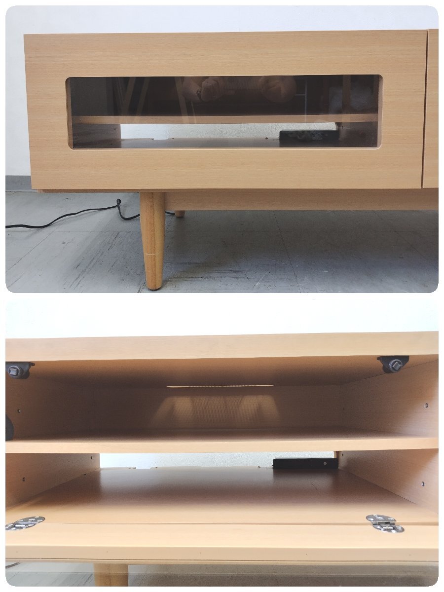 シンプルなデザインのナチュラルテイストのTVボードです。左側にはDVDプレーヤー等のAV機器を収納できガラス製の扉により閉じた状態でもリモコンの操作が可能となっております。中には4口のコンセントタップが付いておりTVボード周りの乱雑になりがちなコードを一にまとめることが出来ます。