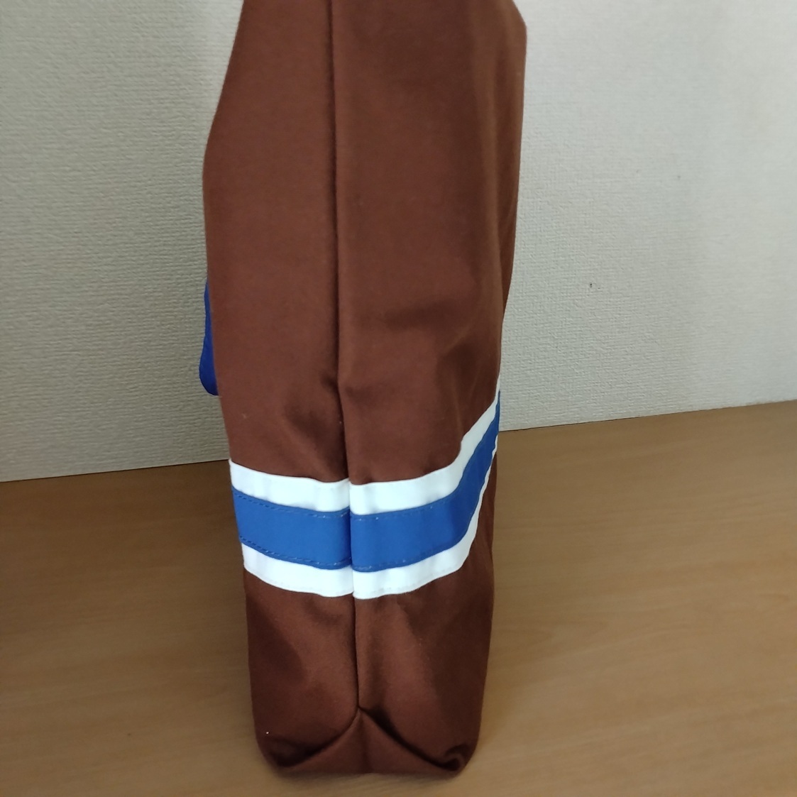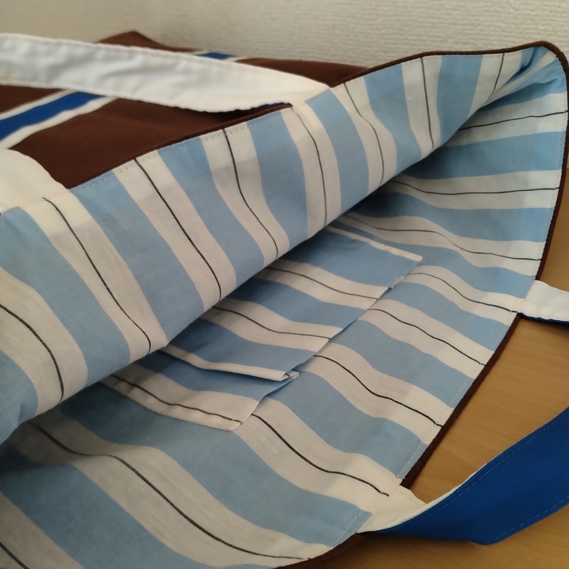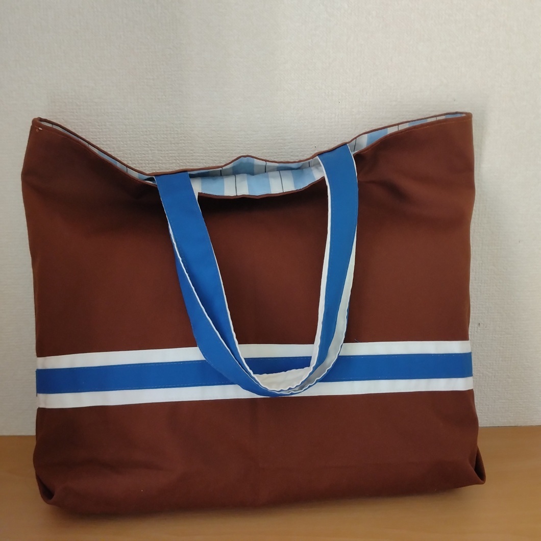ハンドメイド 大きめ レッスンバッグ コットン製 茶(青白)ストライプ 白青 ハンドメイド 中学年 高学年 男子 Y字です。