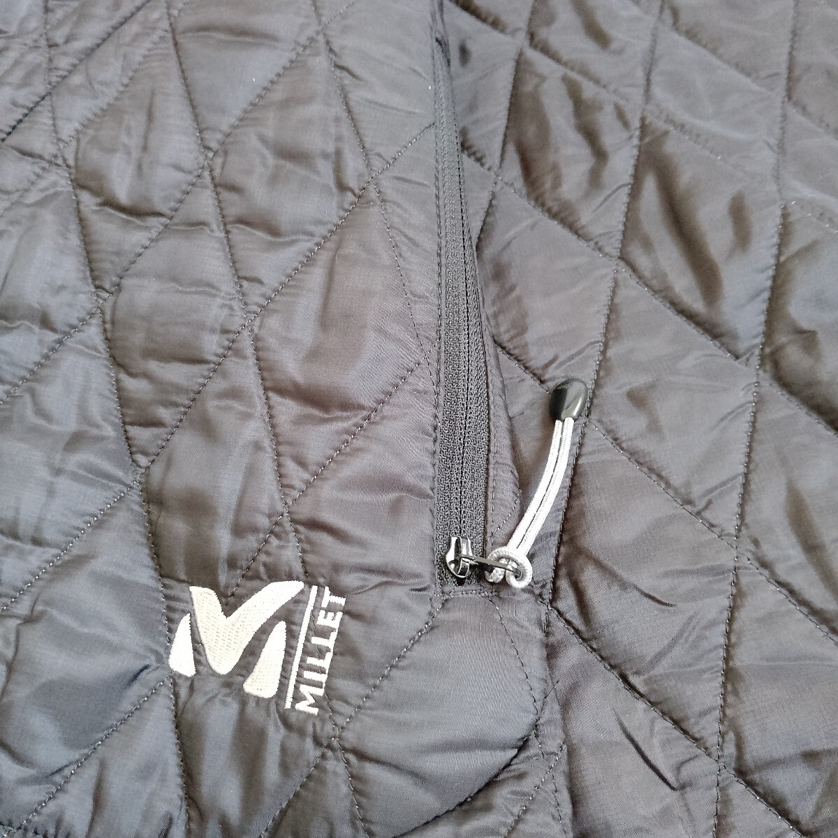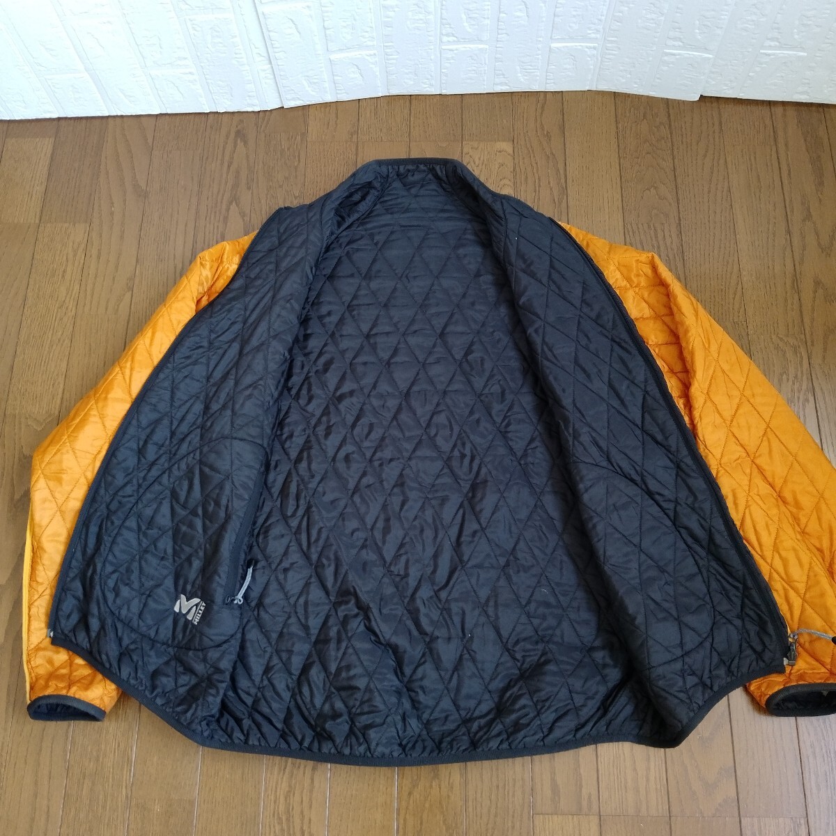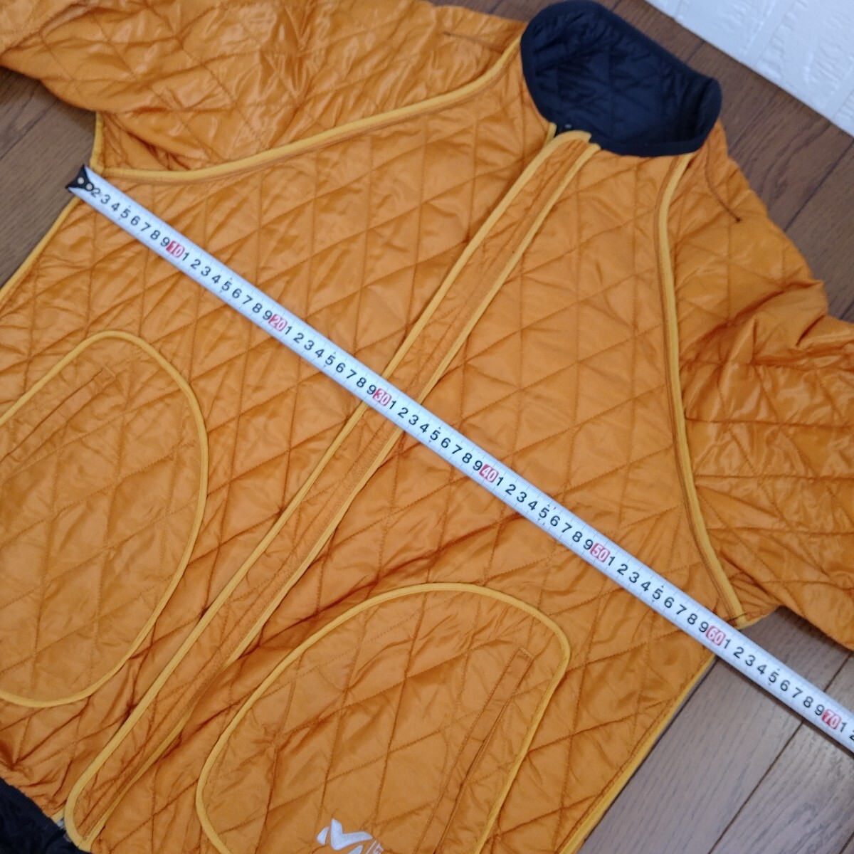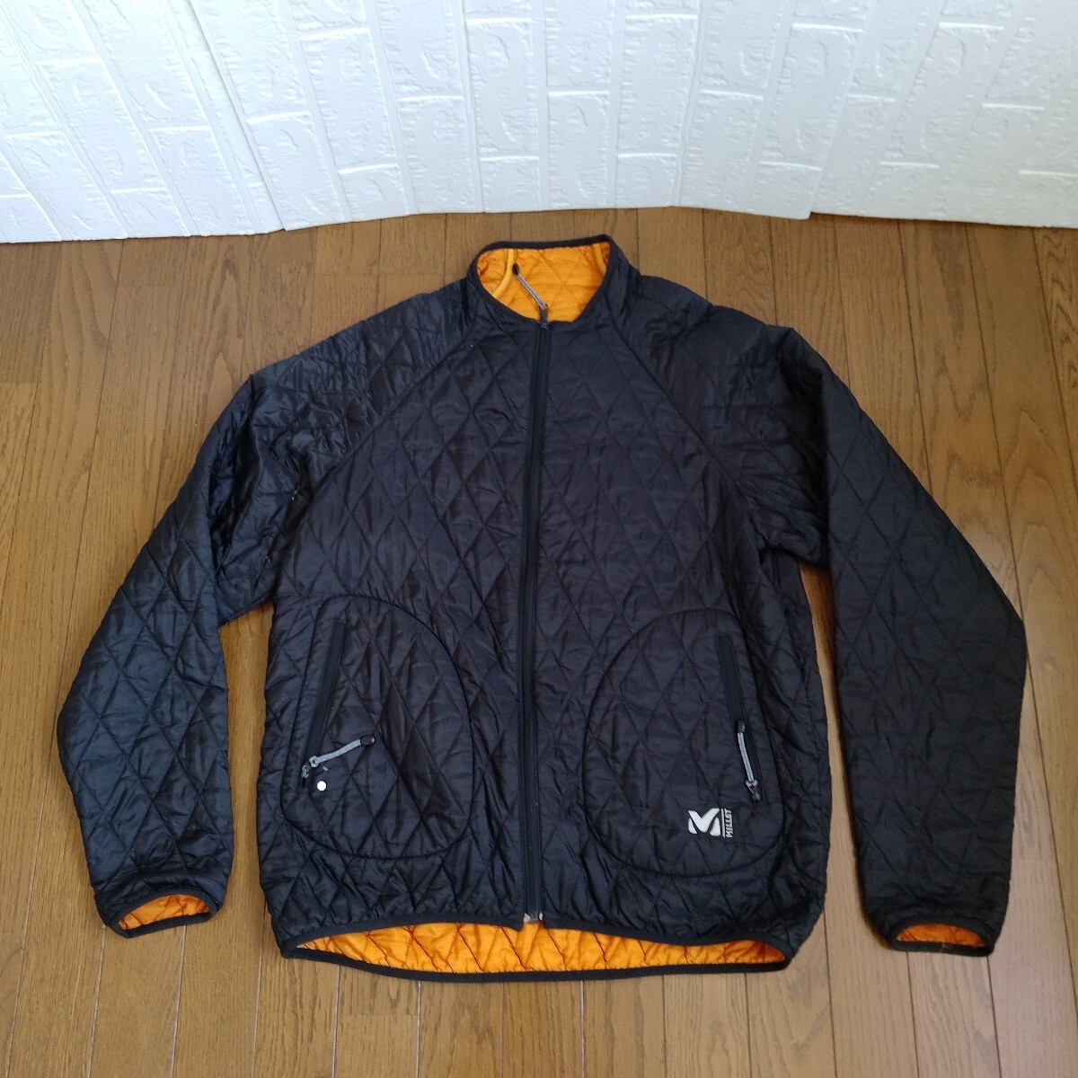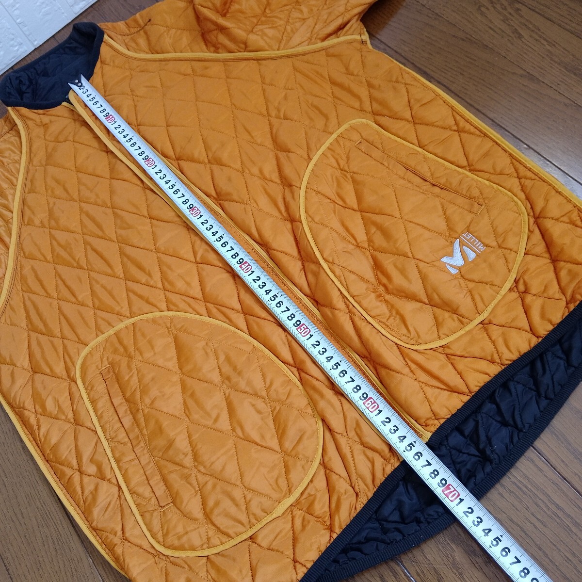 MILLET オレンジ&ブラックリバーシブル キルティングフルジップジャケットです。前ポケット2つ、前左側ポケットに『M』MILLETのロゴ刺繍、黒い側にも同じ箇所にロゴ刺繍がデザインされています。