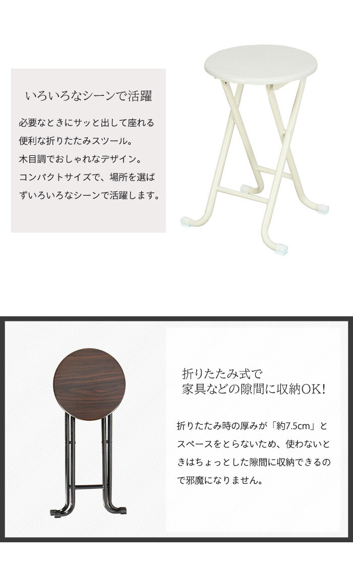 | \折りたたみチェア+丸椅子用クッションカバーのセット/ 本体チェア3色とクッションカバー3色からお好みの組み合わせを選べます。 【折りたたみチェア】 ダイニングチェアやデスクチェア、来客用のイスなど様々なシーンで活躍する折りたたみチェア。 木目調でおしゃれなデザインがお部屋のアクセントにも。 折りたたみ時の厚さが約7.5cmとスペースをとらないため、ちょっとした隙間に収納でき、軽くて持ち運びもしやすいため、必要な時にすぐ取り出して使うことができます。 座面は塩ビシート仕様なので、汚れてもサッと拭くだけでお手入れ簡単。 安定感のある脚部は傷つき防止の保護キャップ付き。 【クッションカバー】 座面にかぶせるだけで簡単に取り付けられる丸椅子用クッションカバー。 裏面には全周ゴムが入っており、着脱しやすくぴったりフィットします。 ふんわり弾力のあるクッションは長時間座っていても疲れにくく、一度使うとやみつきになるような快適な座り心地。 気軽にイスのイメージチェンジが出来て、模様替えをして雰囲気を変えたいなという時にもオススメです。 |