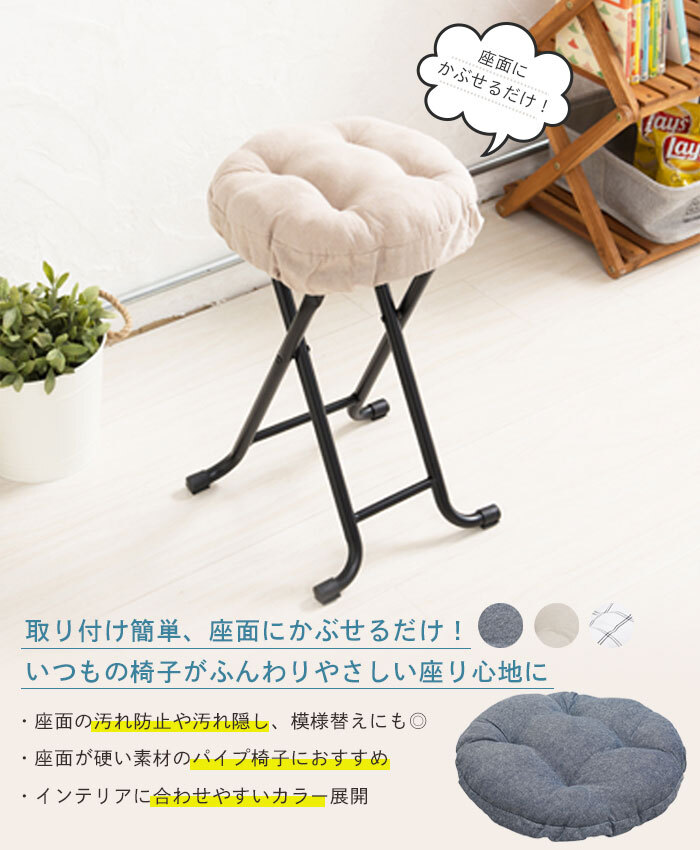 | 【折りたたみチェア】 ◇折り畳み ◇座面ロック機能 ◇脚裏ゴムカバー付 【クッションカバー】 ◇座面直径30cm前後の丸椅子に取り付けできます。 |