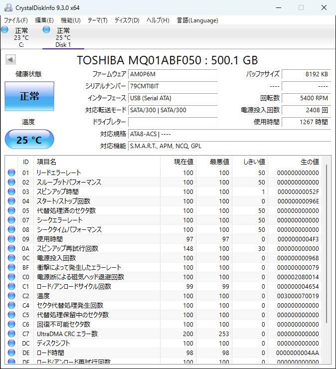 【正常判定】TOSHIBA MQ01ABF05 500GB 1267時間使用 (管理番号 T-66)