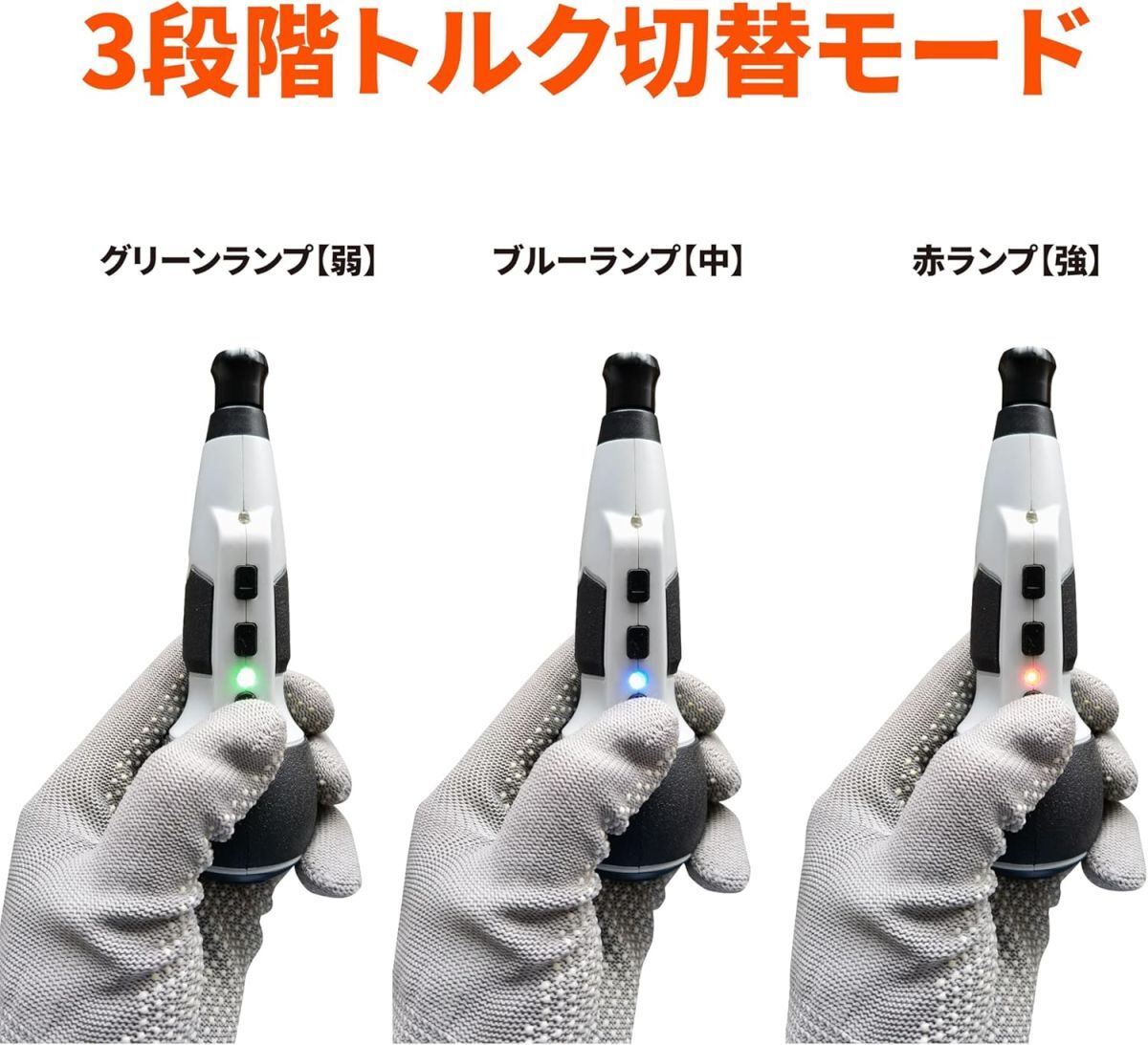 •  【3段階トルク切替モード】(弱/中/強)の3段階で力加減を自由に調整。精密機器からDIYまで、様々な作業に応じて最適なパワーを選択可能。弱【グリーンランプ】約150回転/分、中【ブルーランプ】200回転/分、高【赤ランプ】310回転/分。