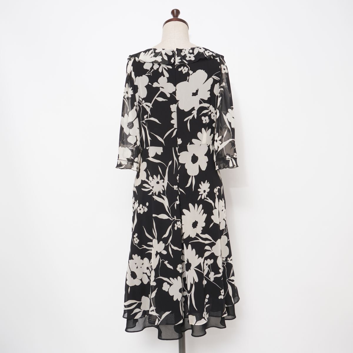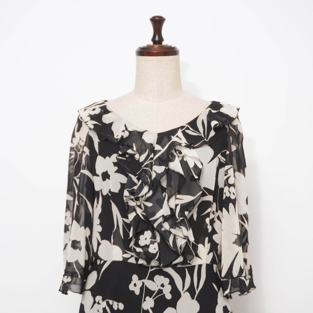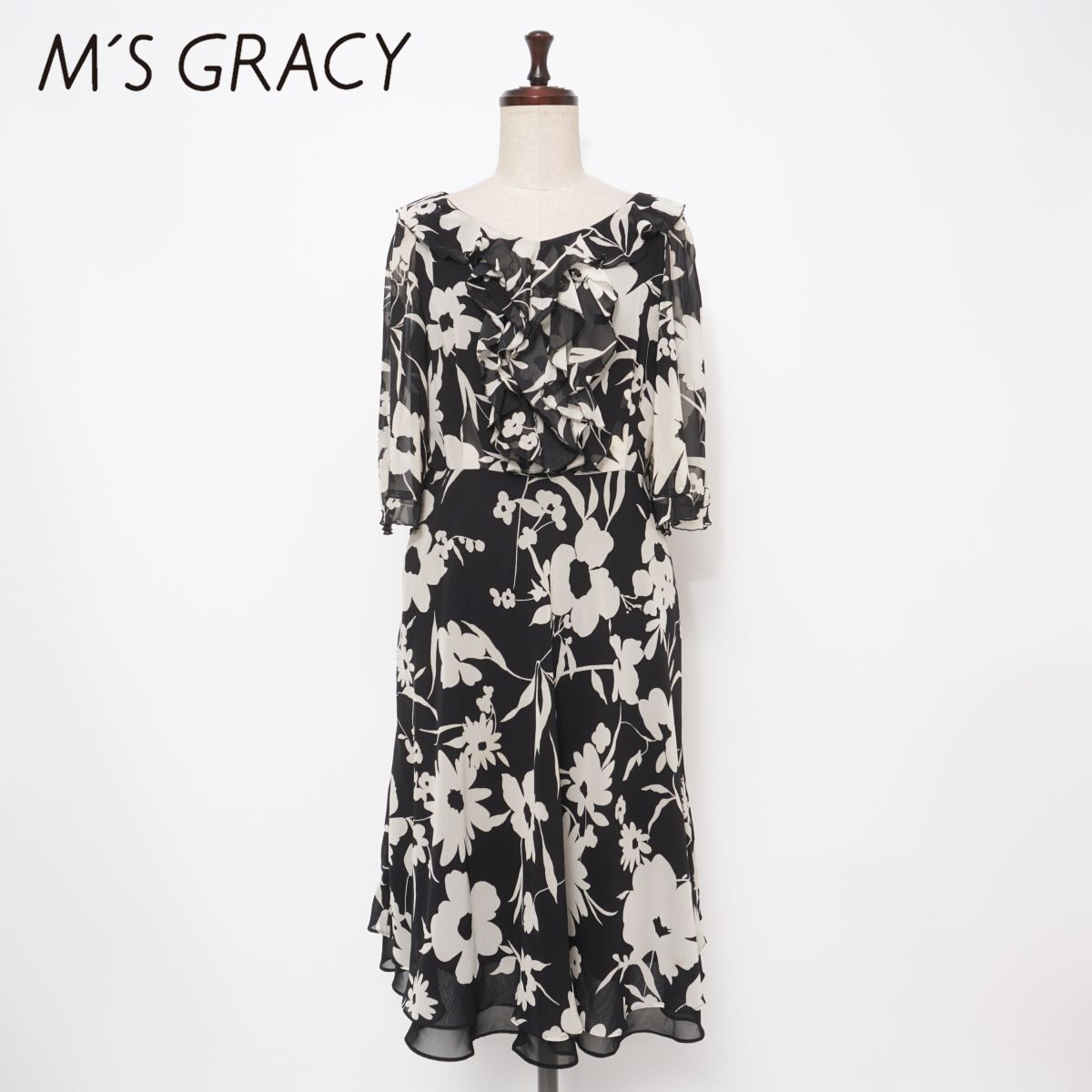 美品 M'S GRACY エムズグレイシー 総花柄ラッフルフリルシフォンワンピース ミモレ丈 七分袖 白 黒 モノトーン サイズ40*ED1099
