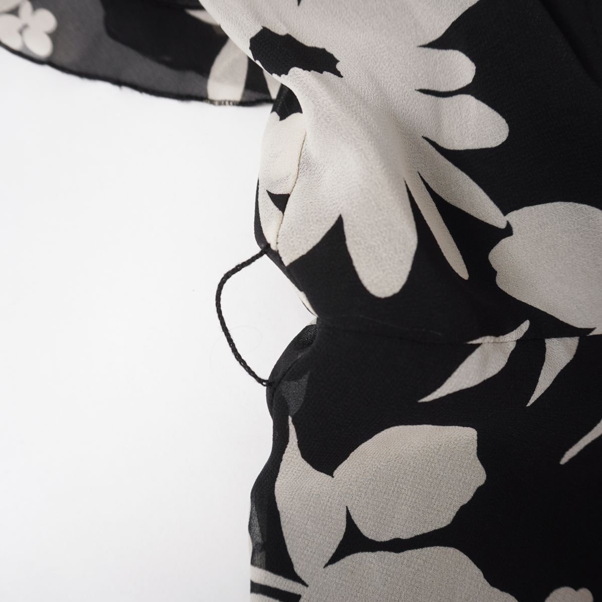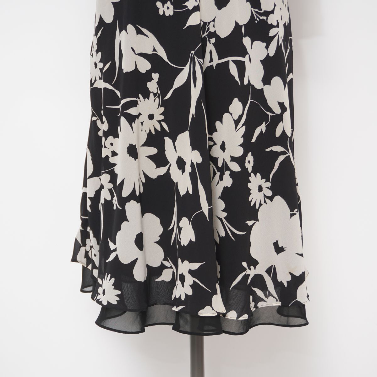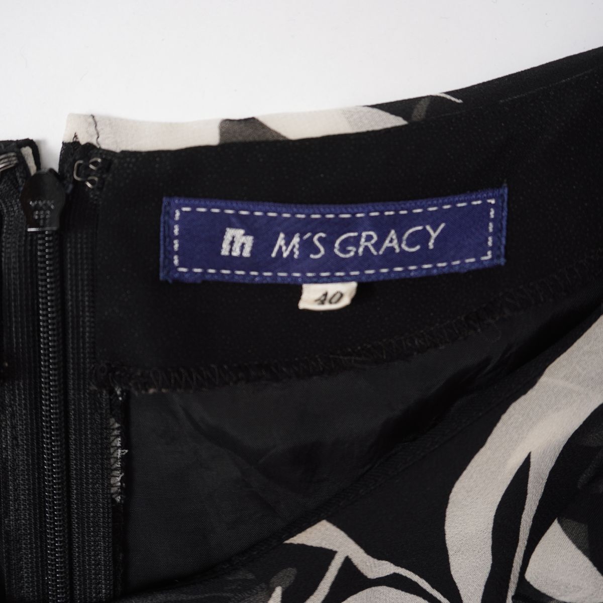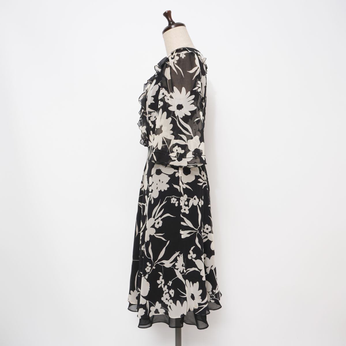 美品 M'S GRACY エムズグレイシー 総花柄ラッフルフリルシフォンワンピース ミモレ丈 七分袖 白 黒 モノトーン サイズ40*ED1099