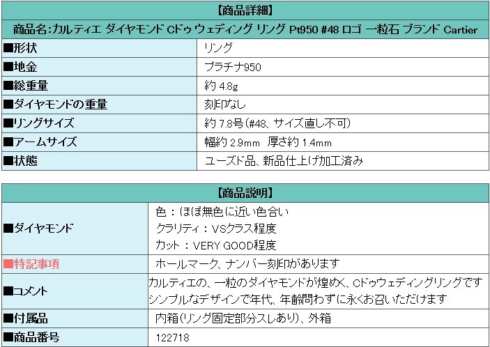 商品名:カルティエ ダイヤモンド Cドゥ ウェディング リング Pt950 #48 ロゴ 一粒石 ブランド Cartier | |