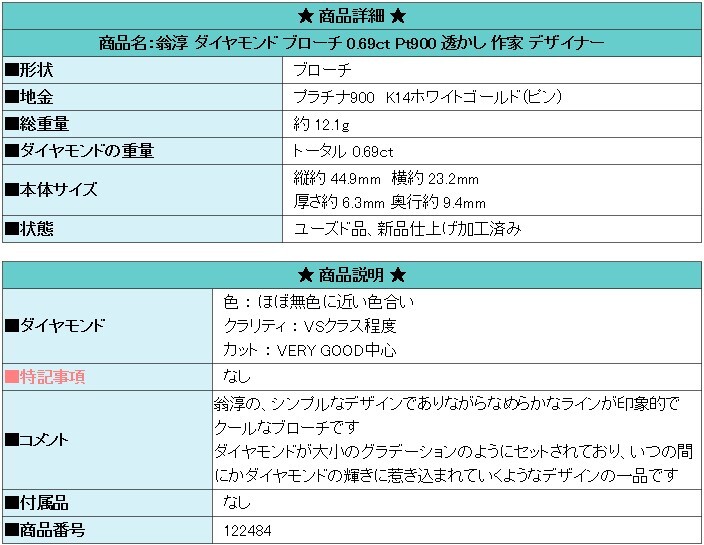 | 商品名:翁淳 ダイヤモンド ブローチ 0.69ct Pt900 透かし 作家 デザイナー | |