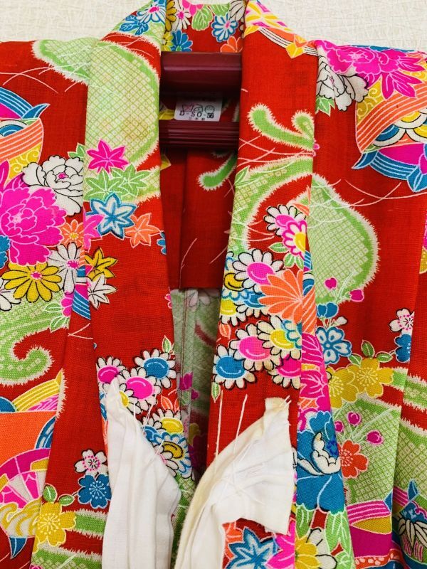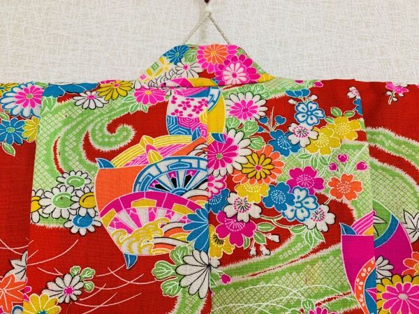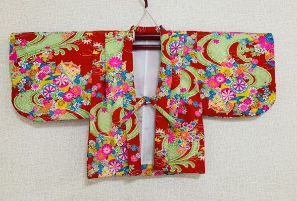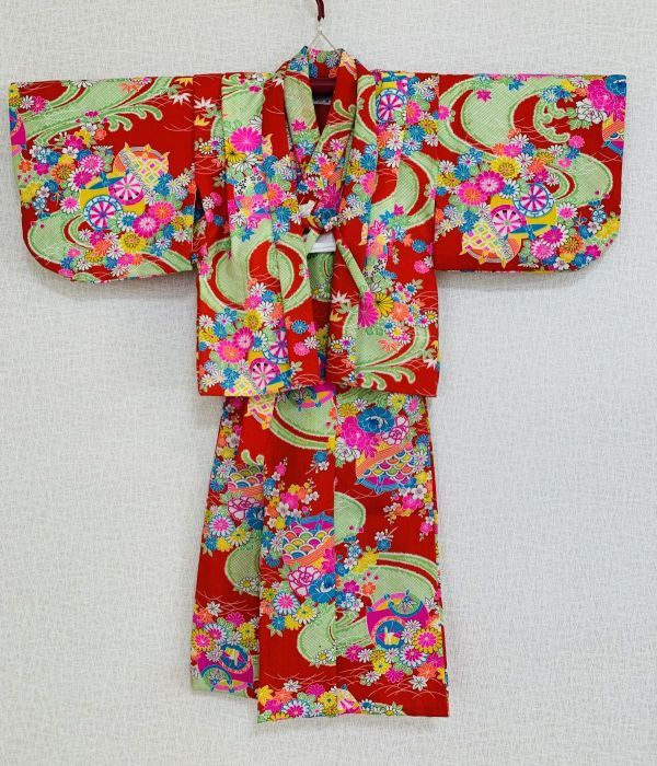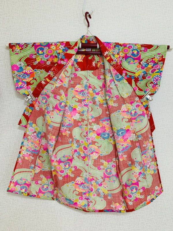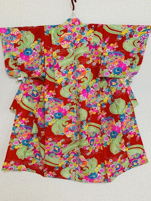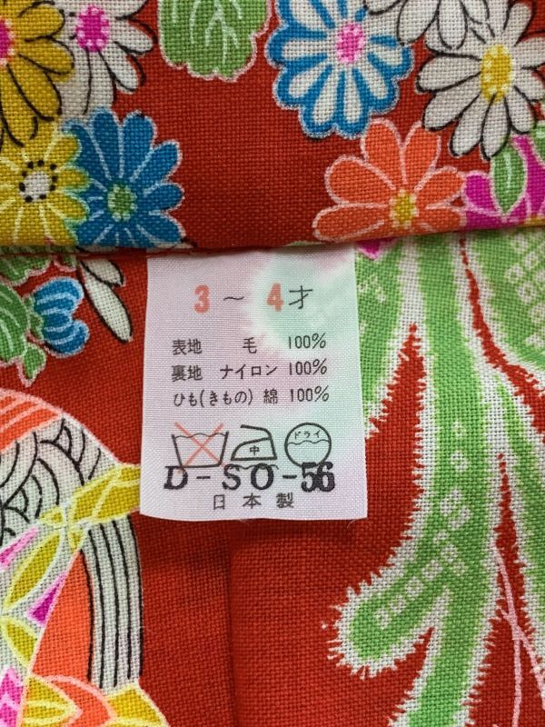 美品 レトロ 女児3~4歳 ウールのアンサンブル着物 猩々緋色にカラフルな吉祥紋様 お正月に コスプレや舞台衣装にも 保管品