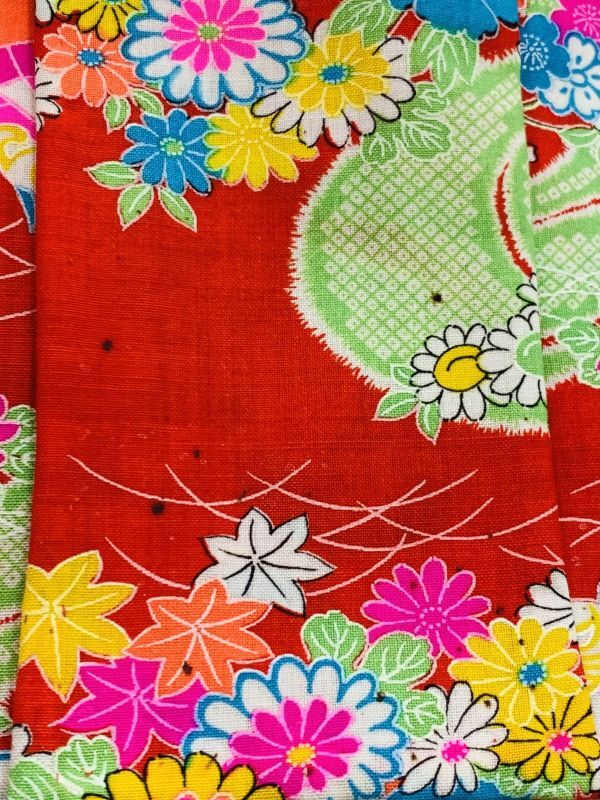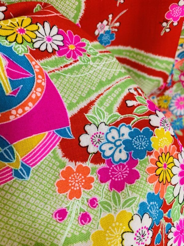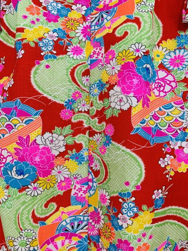 猩々緋色の地にカラフルなお色の吉祥紋様が