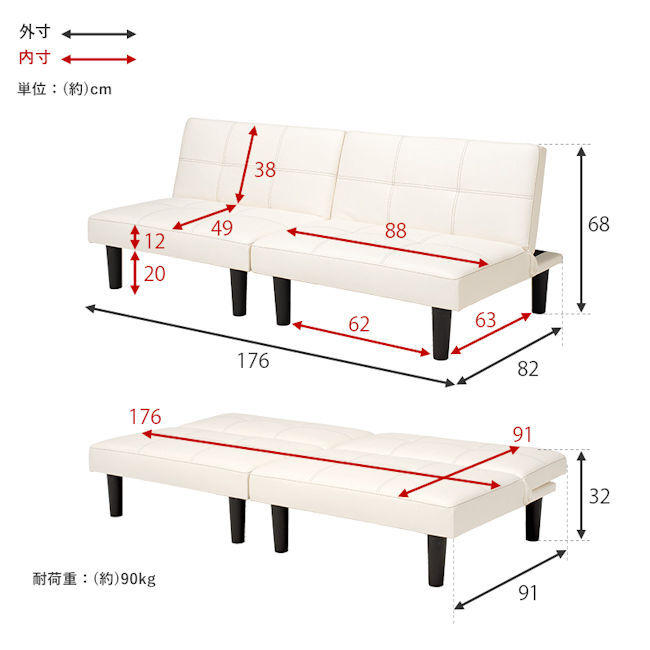 座面内寸(連結した場合):(約)幅176x奥行49x高さ38cm