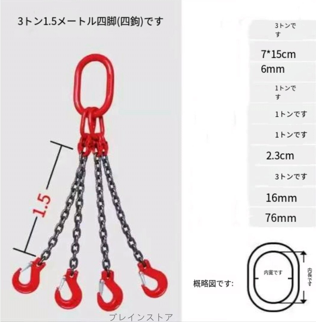 強力推薦★4点チェーンスリング チェーン径6mm 長さ1.5m スリングフックタイプ チェーンフック 吊りクランプ 吊り上げ