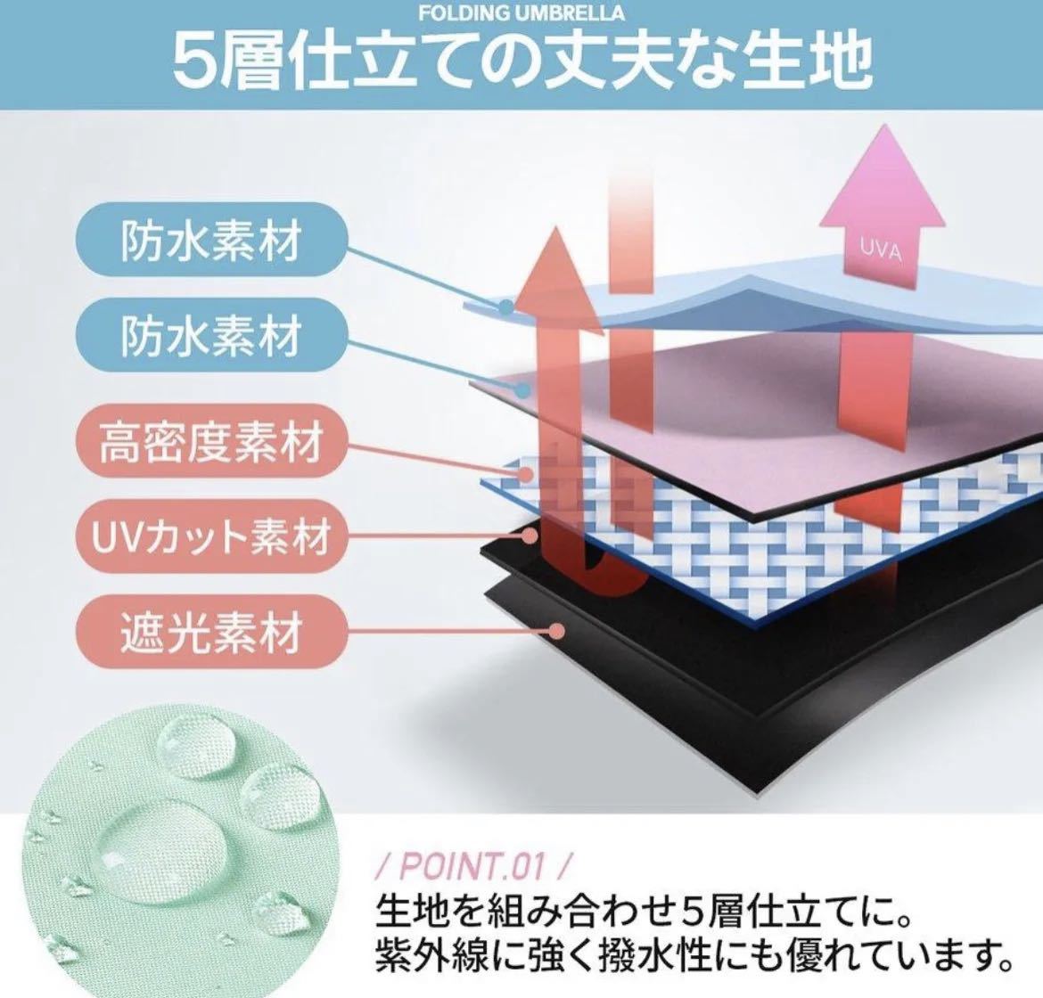 【晴雨兼用&撥水加工】210Tテフロン加工を施した高撥水の生地を使用、雨に濡れてもウソのように水を弾きます。使用後も傘を振るだけで表面に残った水分のほとんどを飛ばすことができます。全天候対応でき、雨の日も雪の日も晴天も使える折りたたみ傘です。