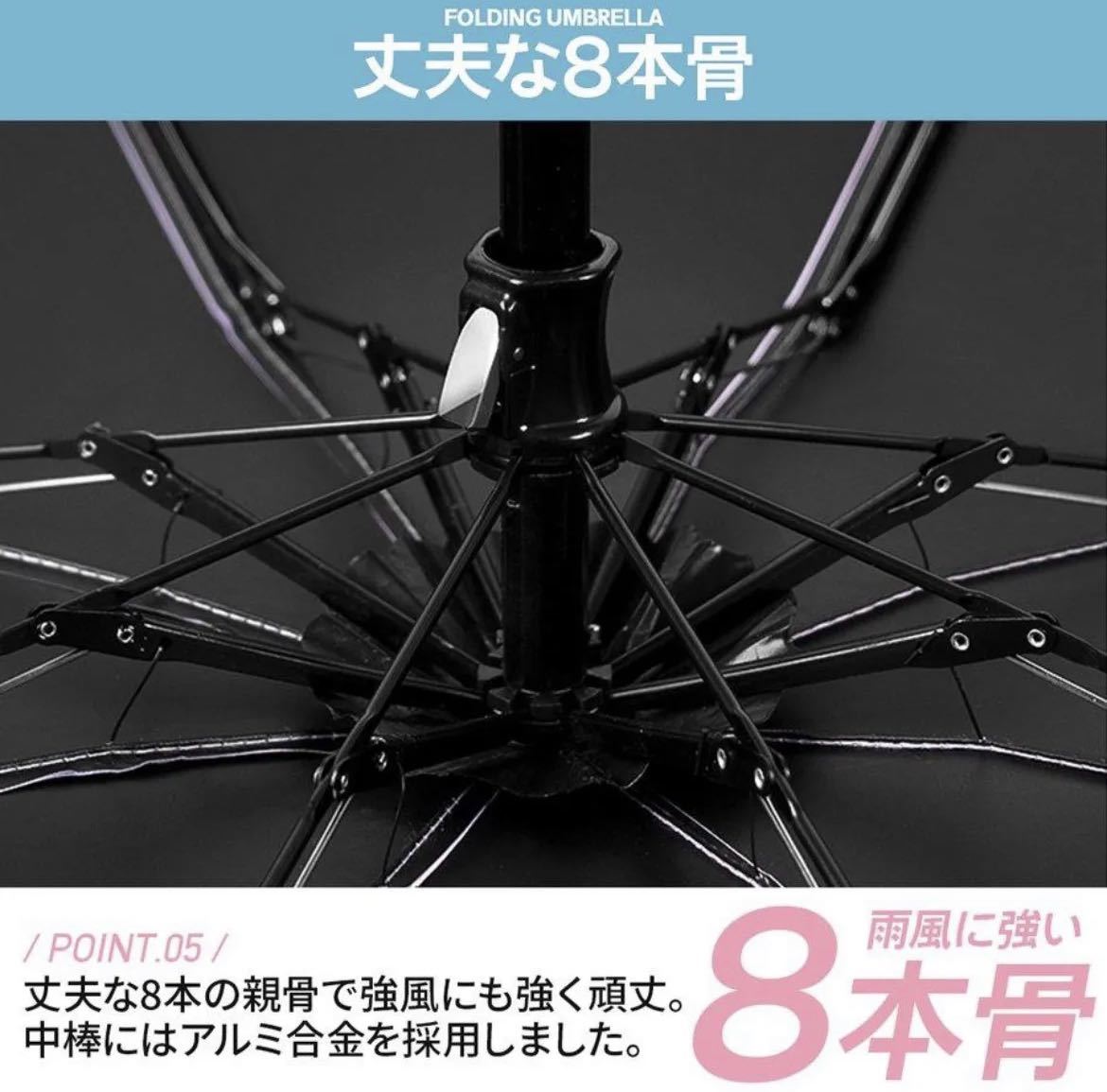 【8本骨構造&強耐風性】折りたたみ式傘は柔軟性、強度を併せ持つグラスファイバーとアルミ合金を採用しており、8本親骨の構造で耐風性と耐久性ともに向上させた!強い風にあおられても折れたり曲がったりしにくいし、万が一逆さに反しても傘を閉じる動作で簡単に元戻り、豪雨、強風など天候の不安定な日でも安心できます。