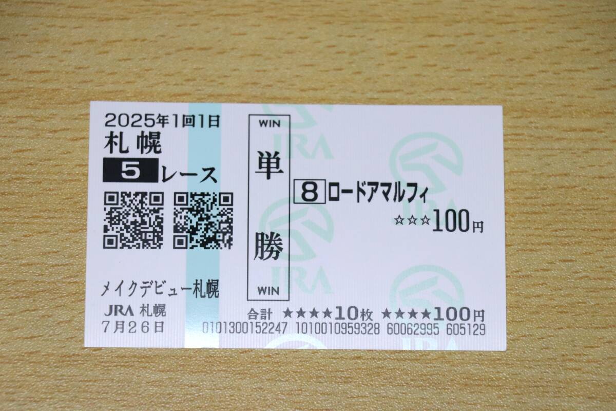 ロードアマルフィ メイクデビュー札幌 5R (2025年7/26) 現地単勝馬券(札幌競馬場)です。気に入って頂けた方の落札を心よりお待ちしております。