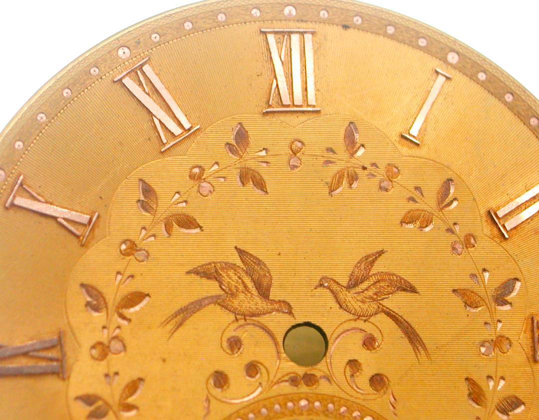 レアな極上の懐中用手彫り装飾された金無垢 (14K以上)文字盤で、12サイズ(38,4mm・秒針距離9,9mm)・足付きですので改造やグレードアップにどうぞ。 |