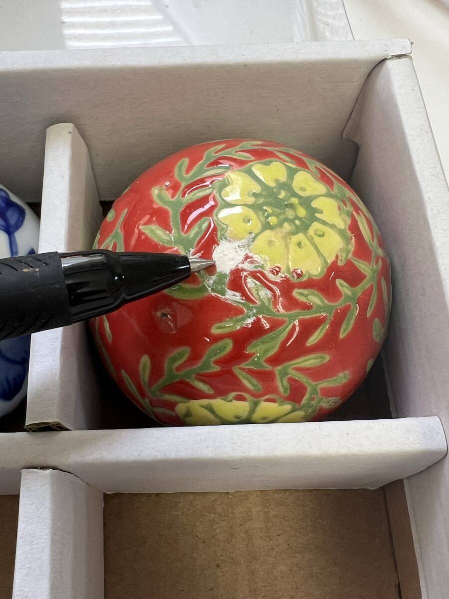 画像にある穴は陶器を焼くときに台の跡です、傷ではありません。