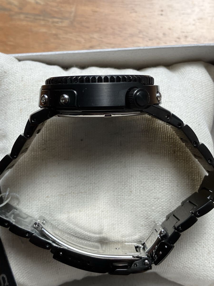 ブラックボディのツナ缶にデジタル付きのフェイスが斬新です。ベルトはメタルなので重厚感もあり高級感も醸し出しています。