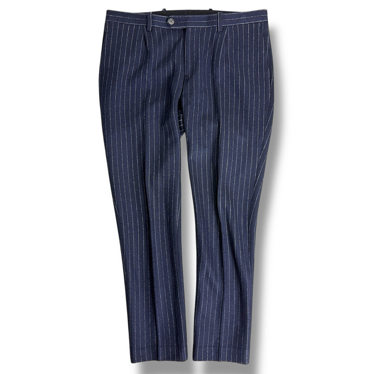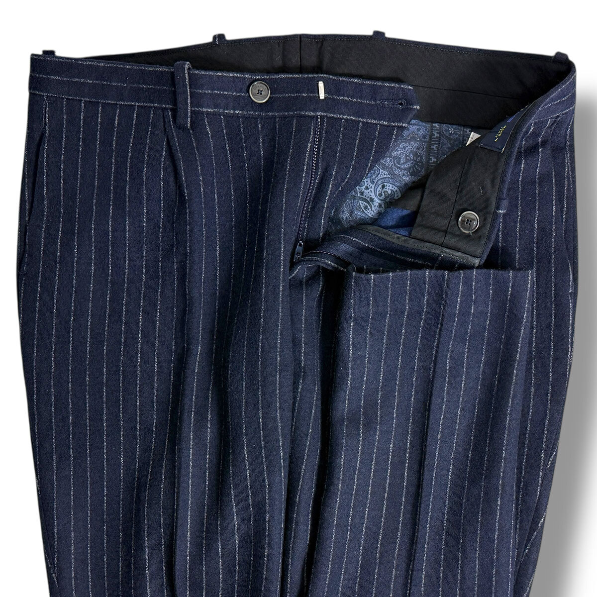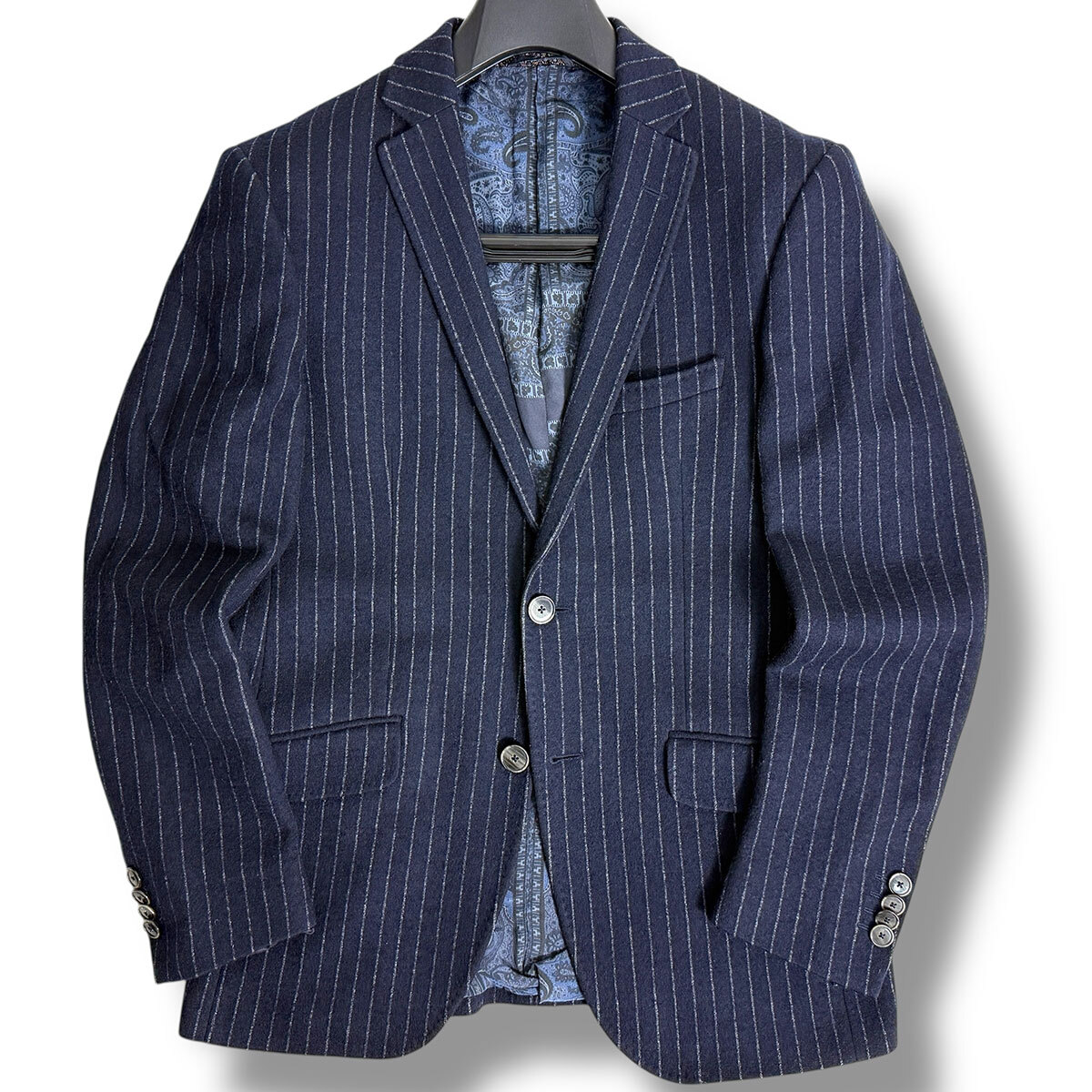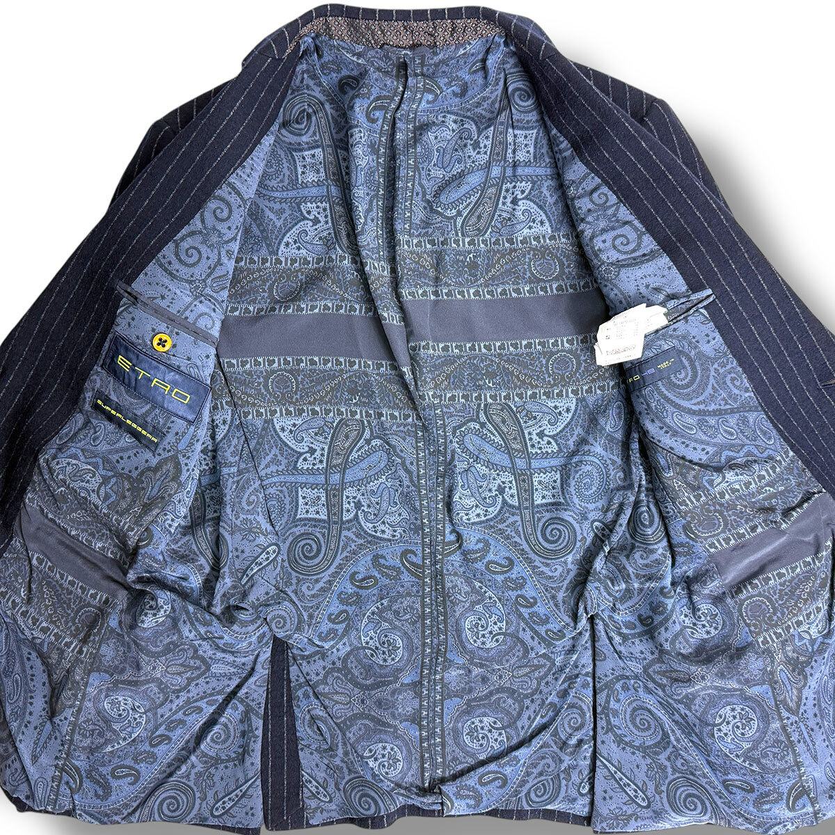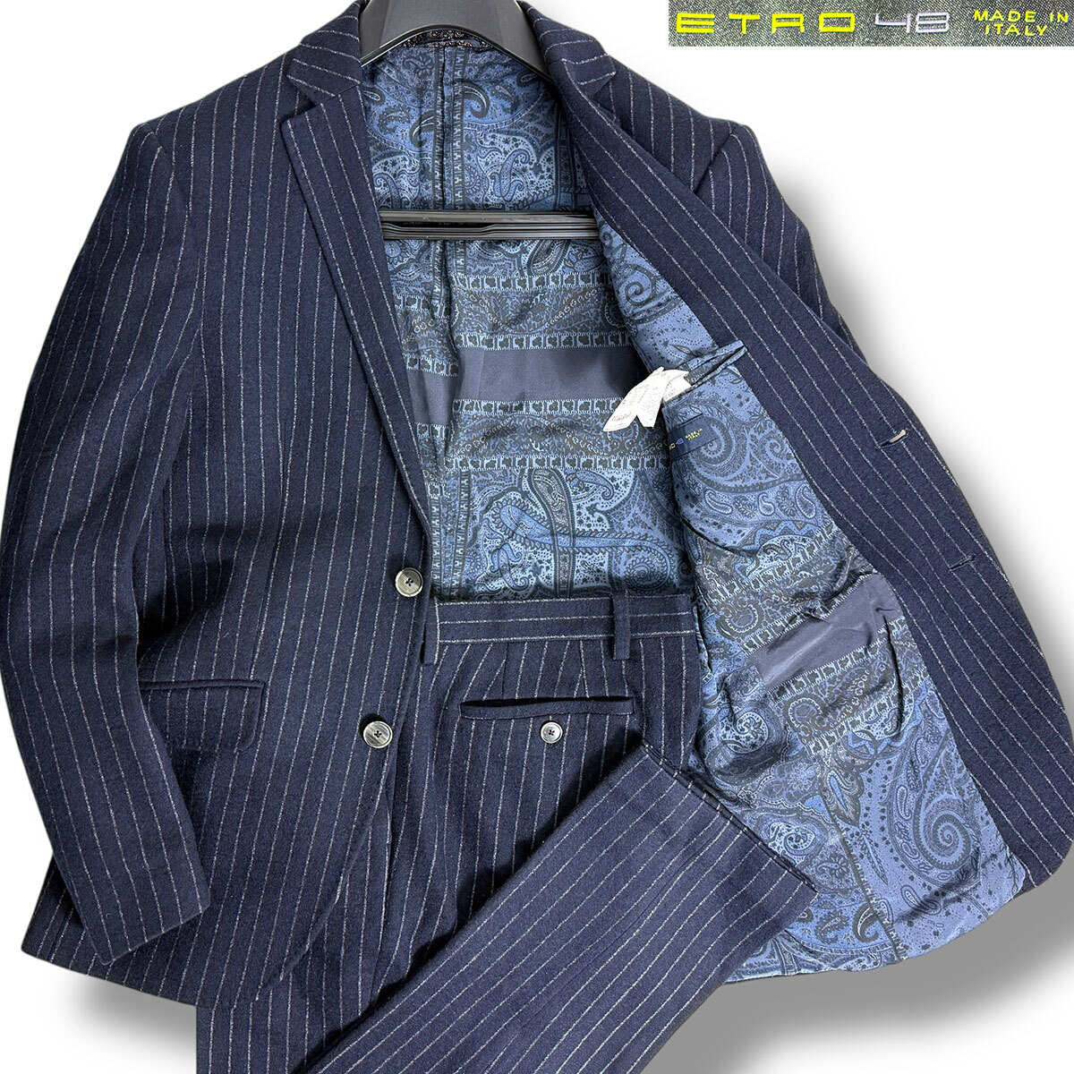 J7338 美品 エトロ SUPERLEGGERA ペイズリー柄裏地 ジャージーストライプスーツ ネイビー 48 ETRO