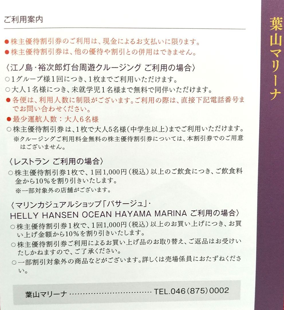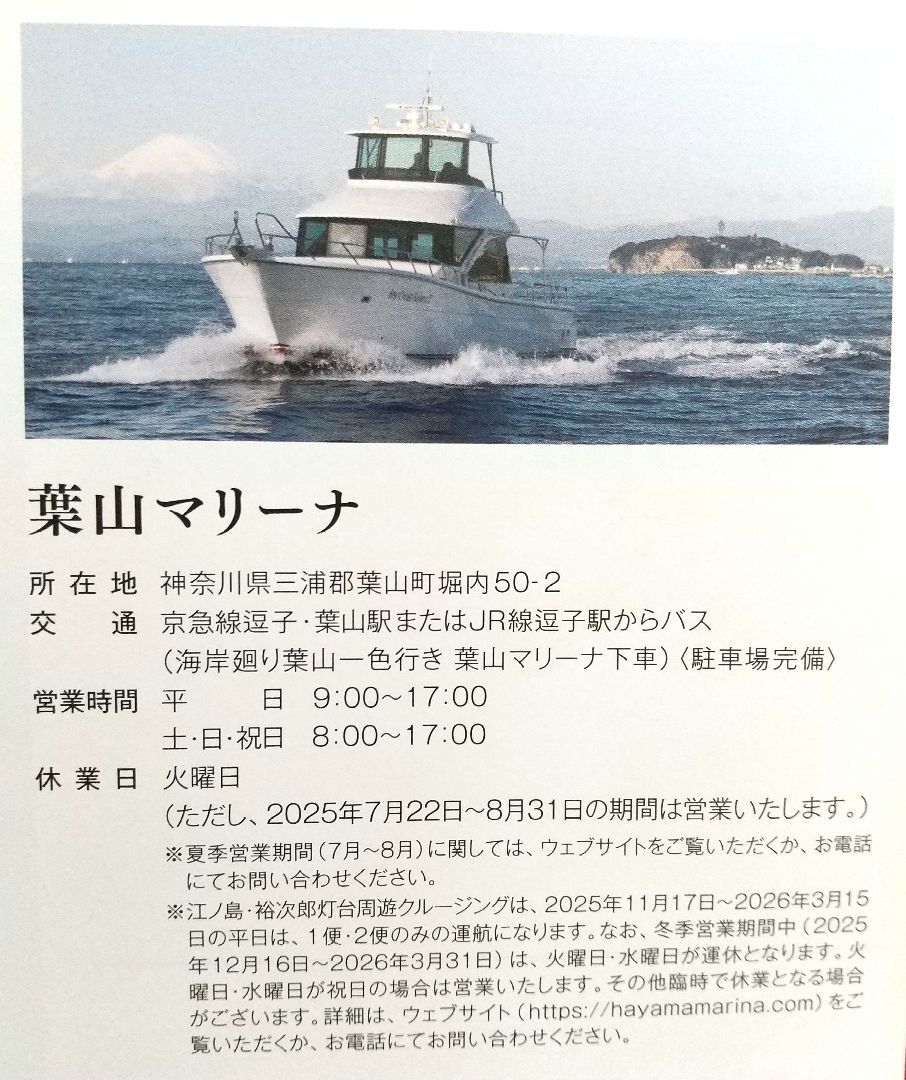 【 江ノ島・裕次郎灯台クルージング ご利用の場合 】 通常料金 3,800円から 3,000円に割引 1枚で、5名様まで割引 (1枚で、最大4,000円割引) 【 レストラン ご利用の場合 】 1,000円以上のご飲食につき、ご飲食料金から10%割引 【 マリーナプラザ内店舗 ご利用の場合 】 1,000円以上のお買い上げにつき、お買い上げ金額から10%割引 各レストラン・マリンカジュアルショップ「パサージュ」 HELLY HANSEN OCEAN HAYAMA MARINA |