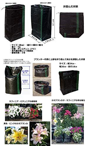 ブランド:アプール●家庭菜園をすると新型コロナウイルスが広範囲に感染したときの対応に、野菜の収穫時期には新鮮な野菜を直ぐに調達することができます。●網状の四角い栽培袋(コンテナ・プランター)なので、花・野菜の根張りスペースが広くあり、通水性や通気性が良いため、根の発育環境に優れています。 ●鉢高約50cm、土量約27?まで入るので大小の植物に合せて高さ調節ができます。●鉢底石が不要で根腐れの心配が殆どありません。●平らな角底になっているので強い風でも倒れにくいです。●軽量でつかみ易いので持ち運びが簡単です。●肉厚が厚く丈夫な素材で紫外線対策がしてあるのため繰り返し利用ができます。●使用しないときは折りたたんで小スペースに保管ができます。●不要時は可燃ゴミとして処分ができます。●屋外で約4年以上使用できます。 ●袋の口紐を締めると強い日差しや雨・風・雹などの対策になります。また土を入れた状態で四角状にすると階段栽培や花台としても使用できます。●収穫袋や保存袋、落ち葉集めなどアイデア次第で多種多様にご使用できます。●商品数量:10枚 ●袋を開いたサイズ:約縦51㎝×横30㎝×幅18cm ●重量:約72g●材質:ポリエチレン ●太陽紫外線対策のUV剤添加 ●原産国:日本 新品●新型コロナウイルスの感染拡大時の対策に家庭で野菜の栽培袋として利用  ●野菜・花の種まきから発育・栽培 ●新商品 ●網状の四角い栽培袋(コンテナ・プランター)なので、花・野菜の根張りスペースが広くあり、、通水性や通気性が良いため、根の発育環境に優れています。 ●鉢高約51㎝まで入るので大小の植物に合せて高さ調節ができます ●鉢底石が不要で根腐れの心配が殆どありません ●平らな角底になっているので強い風でも倒れにくいです。●軽量でつかみ易いので持ち運びが簡単です ●肉厚が厚く丈夫な素材で紫外線対策がしてあるため繰り返し利用ができます ●使用しないときは折りたたんで小スペースに保管ができます ●不要時は可燃ゴミとして処分が可能 ●屋外で約4年以上使用できます。 ●袋の口紐を締めると強い日差しや雨・風・雹などの対策になります ●収穫袋や保存袋、落ち葉集めなどアイデア次第で多種多様にご使用できます ●商品数量:10枚 ●袋を開いたサイズ:約縦51㎝×横30㎝×幅18㎝ ●重量:約72g●材質:ポリエチレン(太陽紫外線対策のUV剤添加) ●原産国:日本 ●実用新案登録品