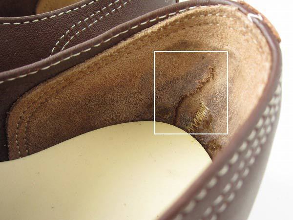 左足踵内張り部分のレザーが破れた状態で重ねられているようですが使用可能です。この点がセカンド品の理由ではないかと思います。
